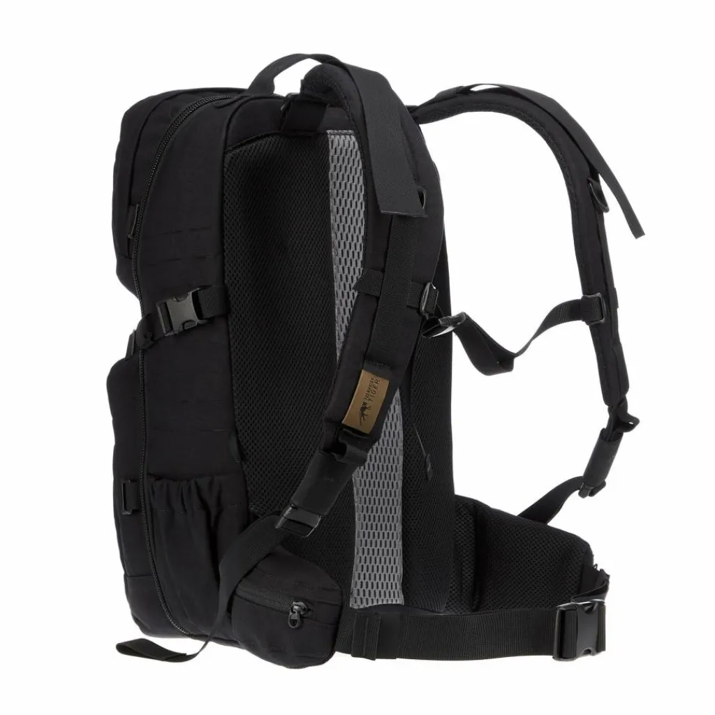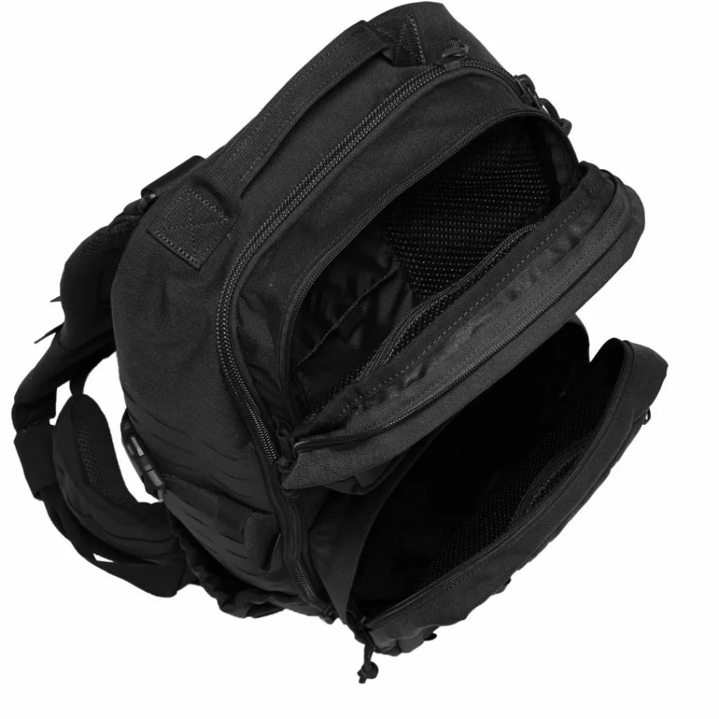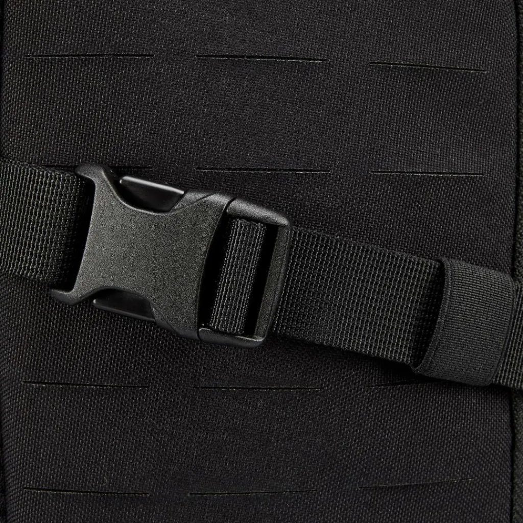 Hinzu kommen verschieden große Befestingsösen auf der Außenseite sowie zwei aufgesetzte Fächer. Der Rucksack kann dadurch mit anderen Gepäckstücken kombiniert und mit dem passenden MOLLE-Zubehör individualisiert werden.