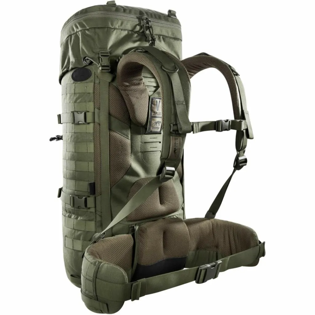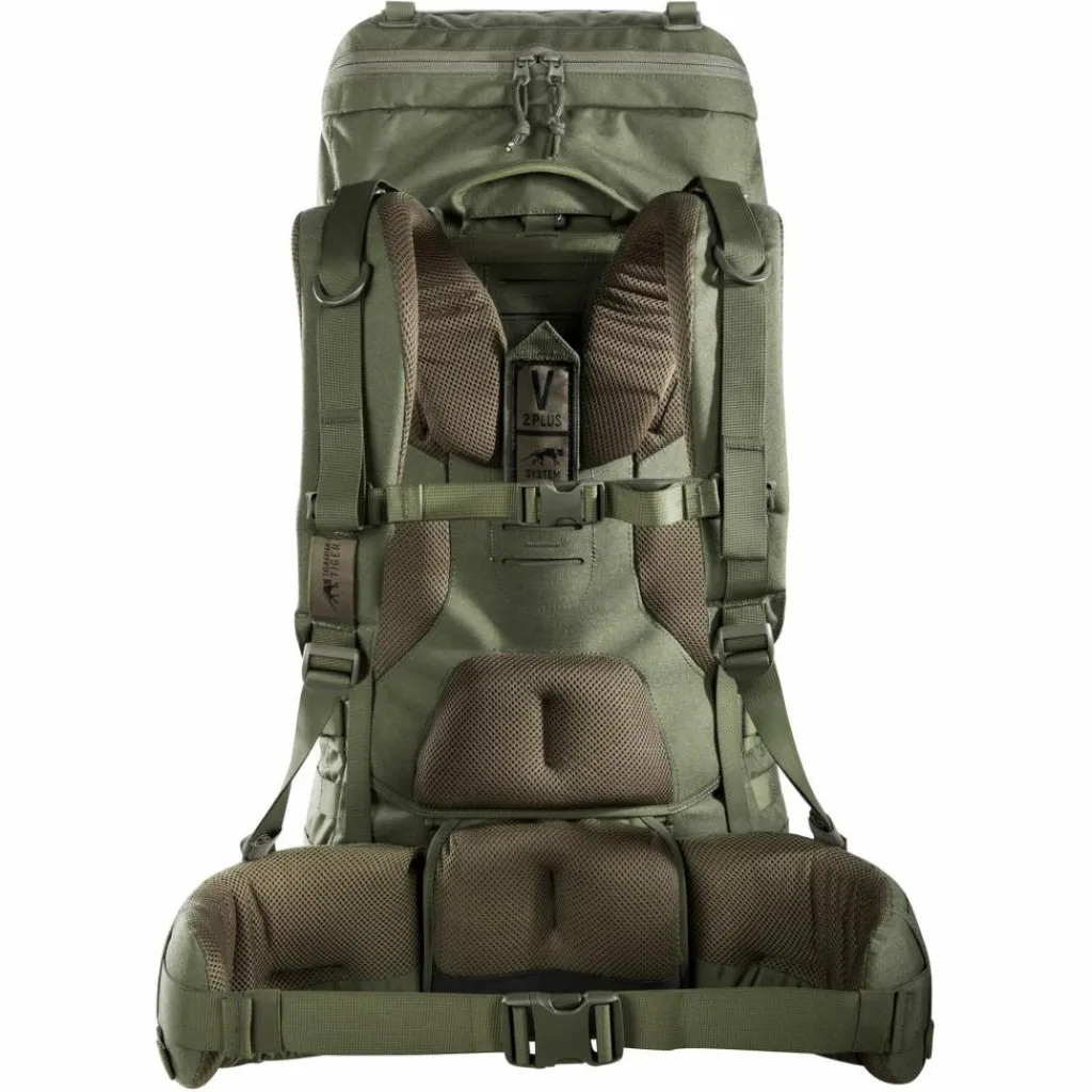 Das große Volumen des Trekkingrucksacks und das entsprechende Gewicht im vollbepackten Zustand wird durch das V2-Tragesystem aufgefangen. Mithilfe zweier in V-Form angeordneter Aluminiumstreben wird die Last dabei effektiv von den Schultern auf die Hüfte übertragen. Für den nötigen Komfort sorgen ein dick gepolstertes Lumbalpolster sowie breite Hüftgurte, die helfen das Gewicht gleichmäßig über deine Hüften zu verteilen. Der Rücken ist ebenfalls großzügig gepolstert und lässt sich für eine optimale Passform in der Höhe verstellen.