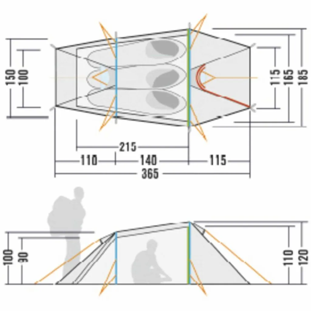 Da Innen- und Außenzelt miteinander gekoppelt sind, werden sie ganz einfach gemeinsam aufgebaut. Soll das Innenzelt bei Regen trocken verstaut werden, lässt es auch aushängen. Die Tunnelkonstruktion ist, mit der Schmalseite zum Windrichtung ausgerichtet, sehr windstabil.
