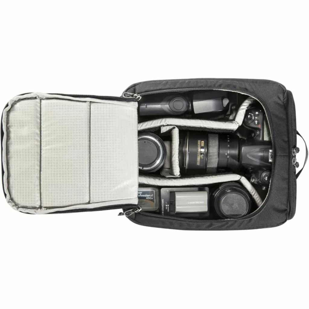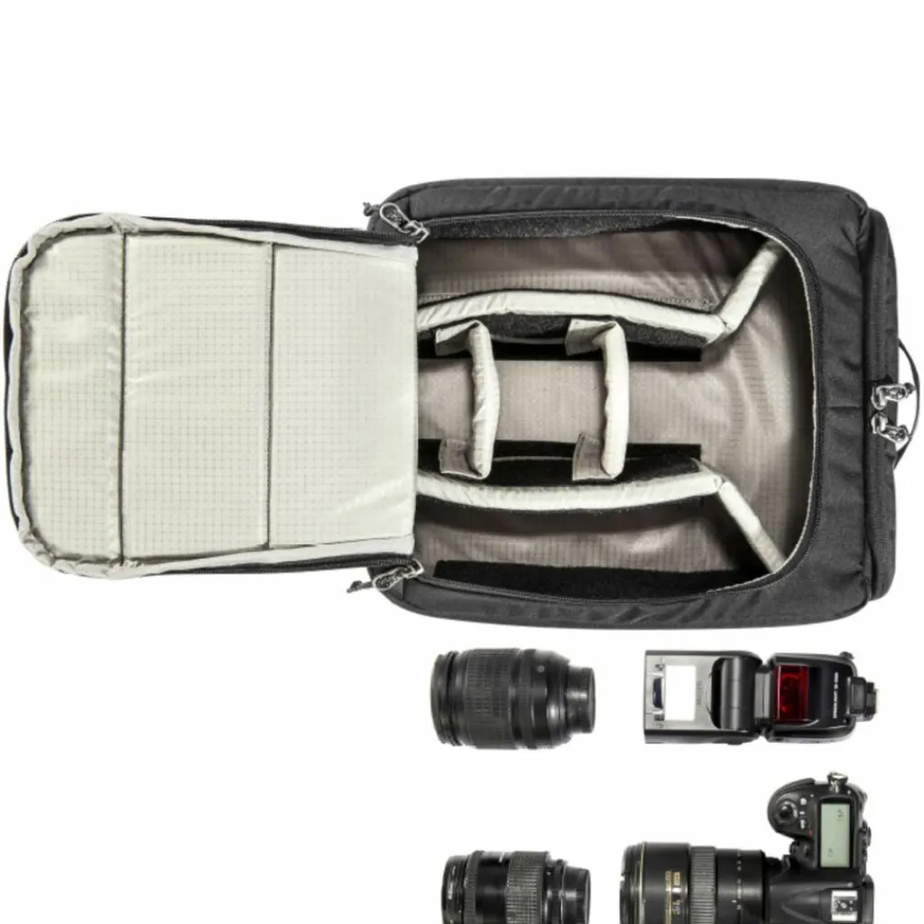 In der Kameratasche ist Platz für deine Kamera und 2 – 3 Objektive oder Zubehör. Die Aufteilung kannst du ganz einfach per Klettverschluss-Trenner selbst bestimmen.