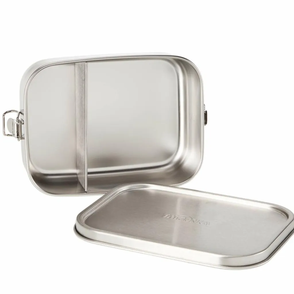 Durch den Bügelverschluss ist ein einfaches Öffnen und Schließen möglich. Er verhindert auch, dass sich die Dose im Gepäck unbeabsichtigt öffnen kann. Das Innenfach ist durch einen Steg unterteilt und schafft zwei unterschiedlich große Fächer, die zur separaten Aufbewahrung von Brot und Früchten dienen kann.