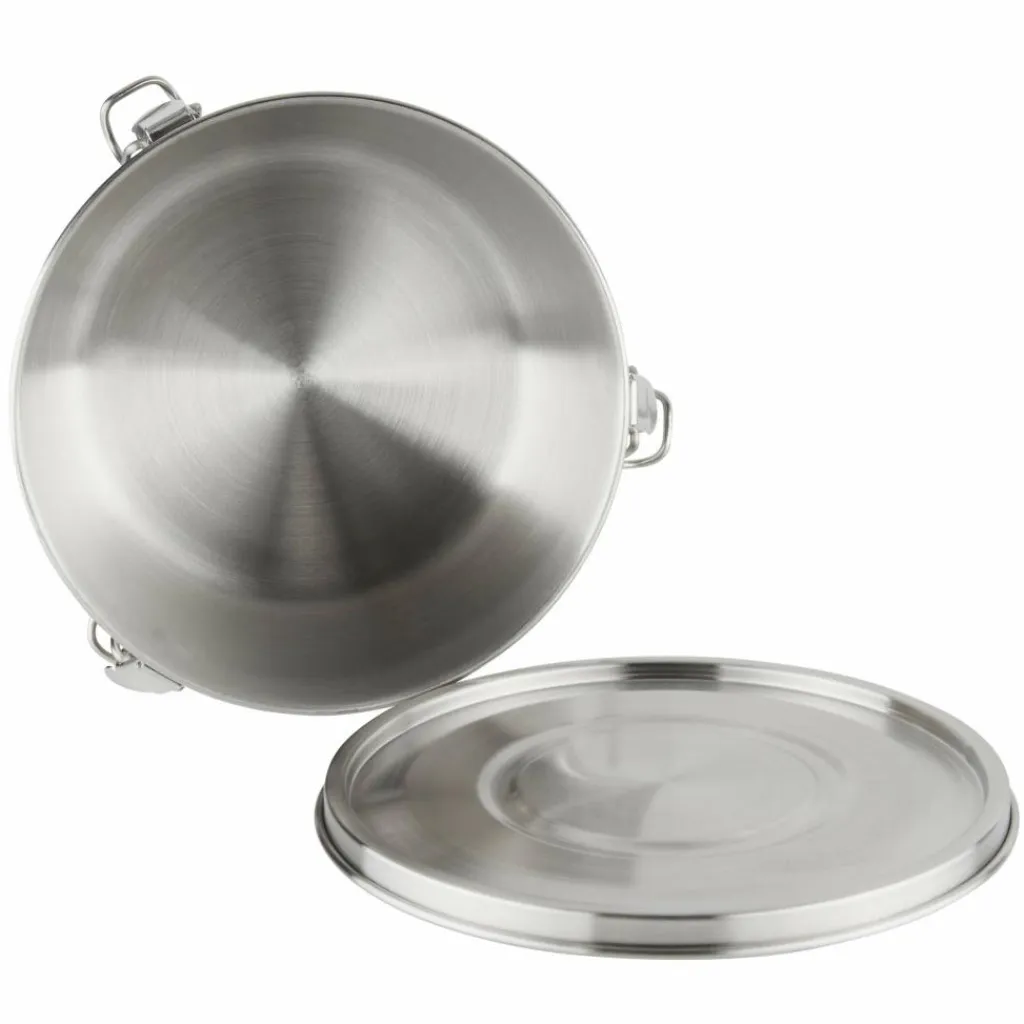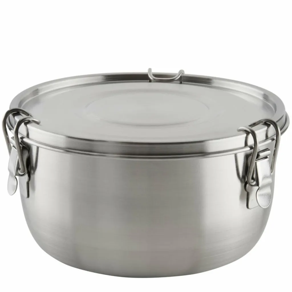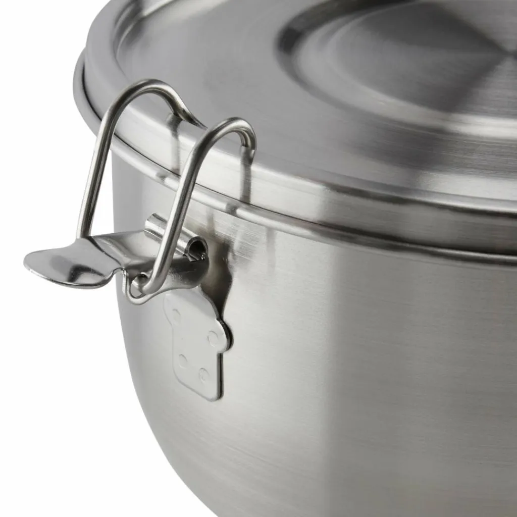 Schüssel aus 18/8 Edelstahl, ausgestattet mit einem Deckel, der mit drei Bügelverschlüssen sicher in Position gehalten wird. Der Deckel ist mit einer BPA-freien Gummidichtung ausgestattet.