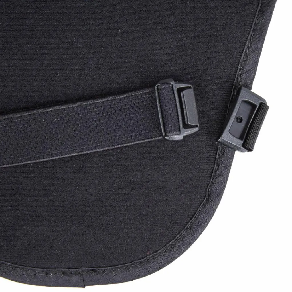 Der obere Gurt läuft diagonal über deine Schulter, der untere um deinen Bauch. So rutscht das Holster nicht. Die Gurte haben je eine flache Blitzschnalle und lassen sich in der Länge verstellen.