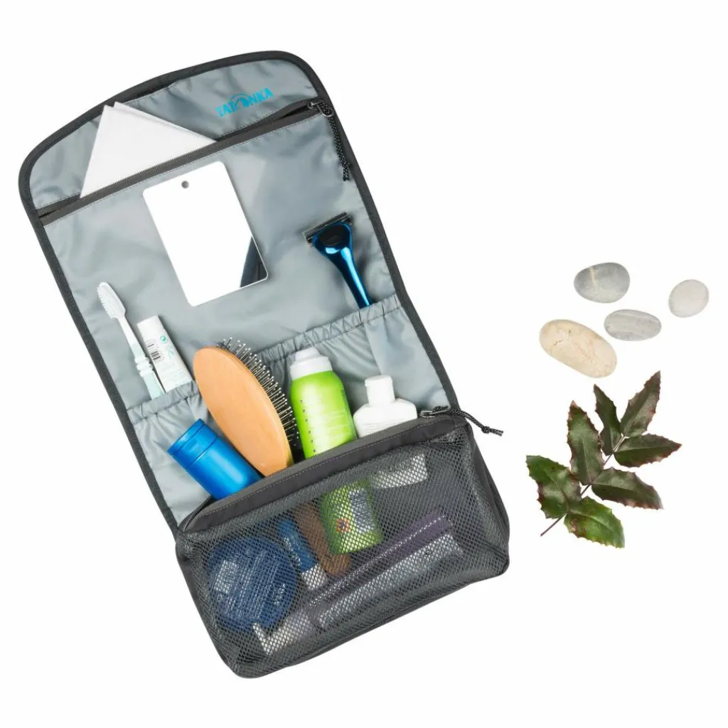 In die Steckfächer passen Zahnbürste, Zahnpasta und Deo. In der Netztasche im unteren Bereich bringst du Duschgel, Shampoo und Rasierer unter. Dank der Belüftung ist es nicht schlimm, wenn diese mal noch etwas feucht sind. Es gibt sogar einen kleinen Spiegel, den du bei Bedarf abnehmen kannst.