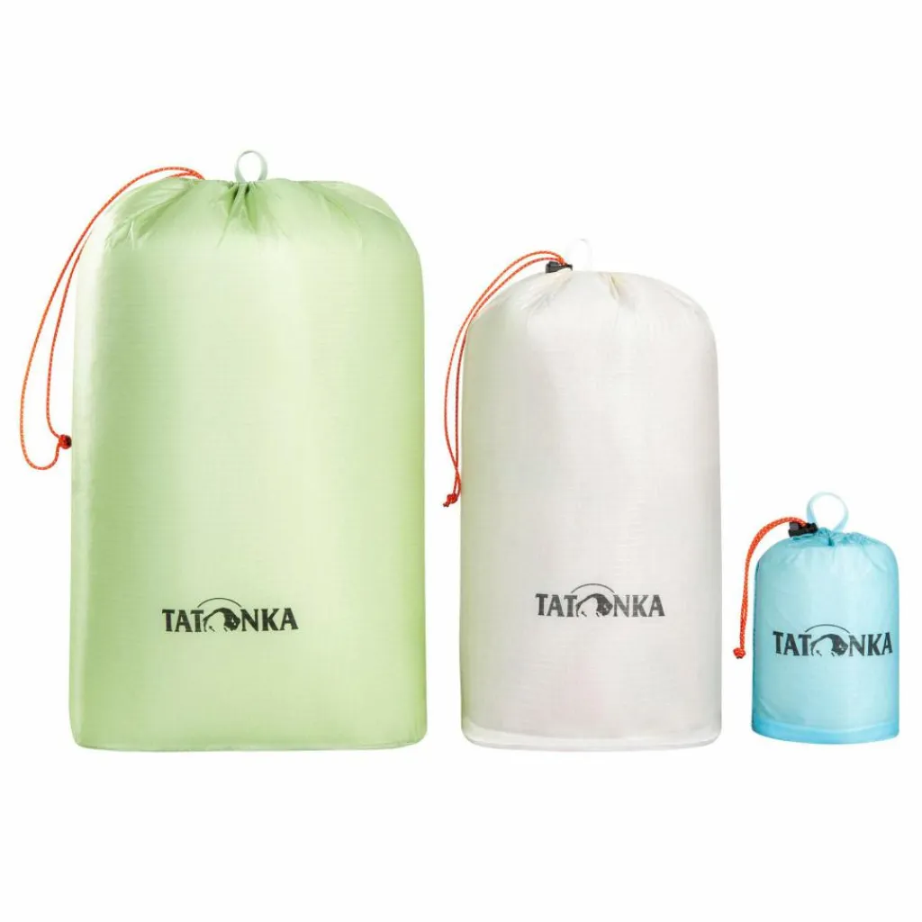 Das Packbeutelset besteht aus den Größen 0,5 Liter (13 x 8 x 5 cm, 10 g), 5 Liter (30 x 17,5 x 10 cm, 25 g) und 10 Liter (38 x 24 x 13 cm, 35 g).