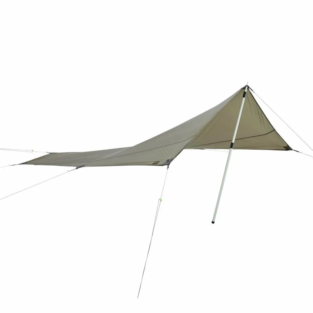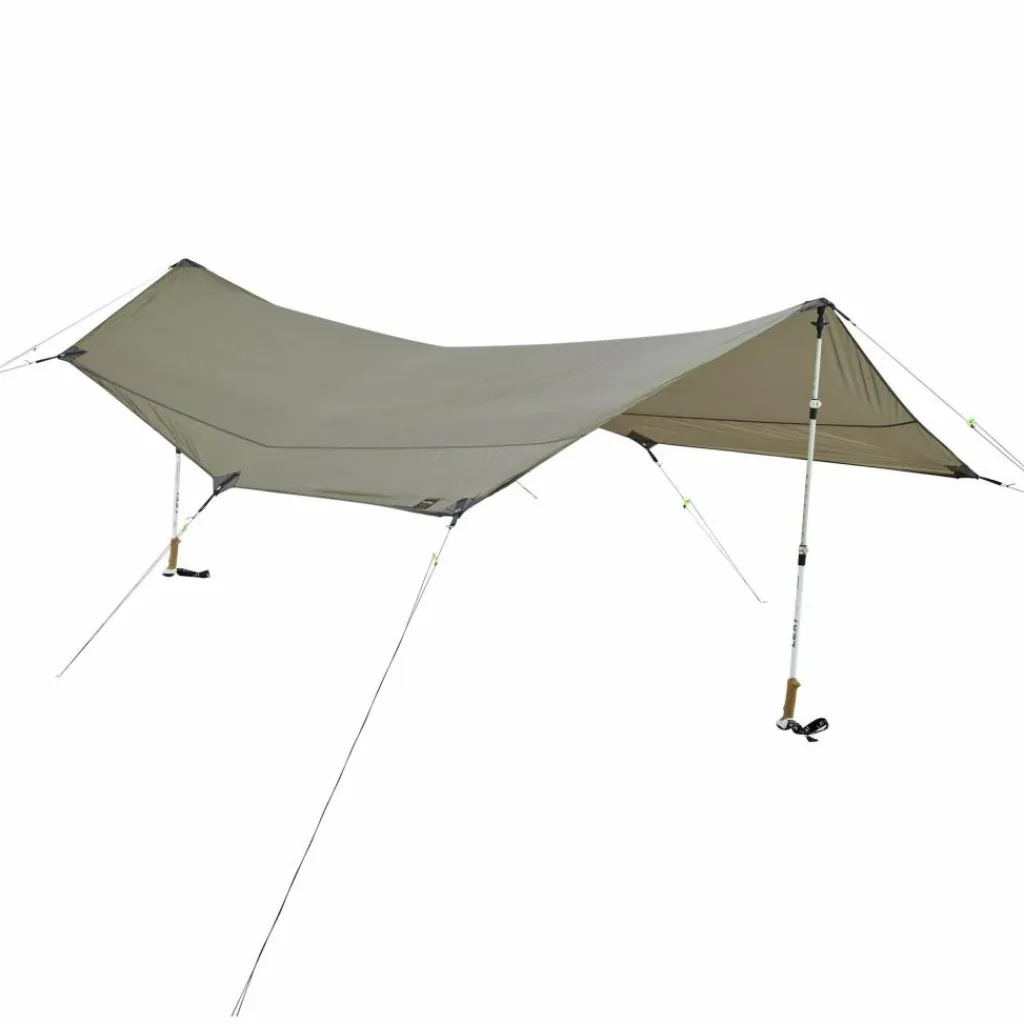 Das leichte Tarp mit Minimalschnitt ist klein im Packmaß und daher optimal für Trekkingtouren geeignet. Es lässt sich gut mit Trekkingstöcken, Tarpstangen oder nur mit Schnüren abspannen.