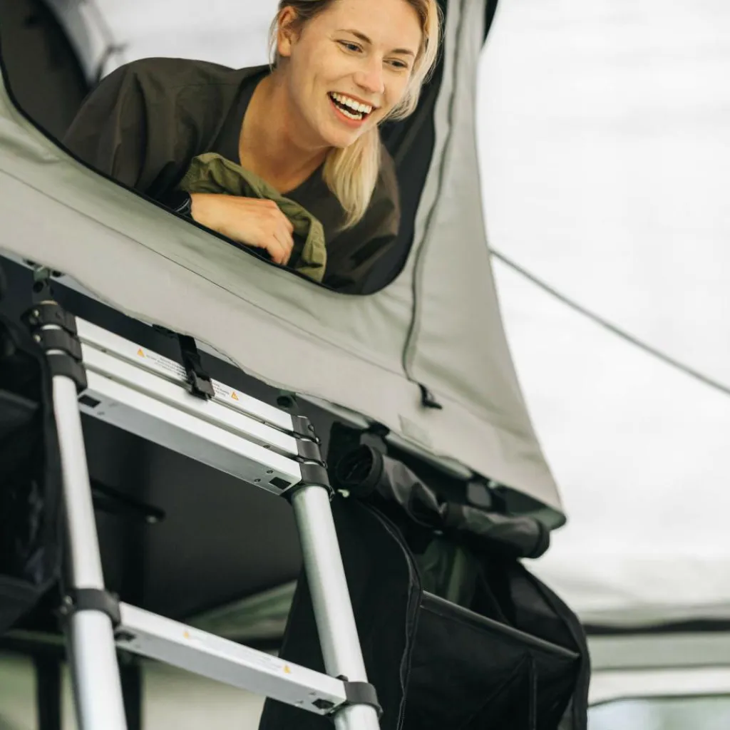 Am Ziel angekommen ist das Dachzelt in wenigen Minuten aufgeklappt und fertig aufgebaut. So kannst du direkt entspannen, das Zelt lüften oder dich nach einem langen Tag auf Wanderungen oder der Straße ins Bett zurückziehen.