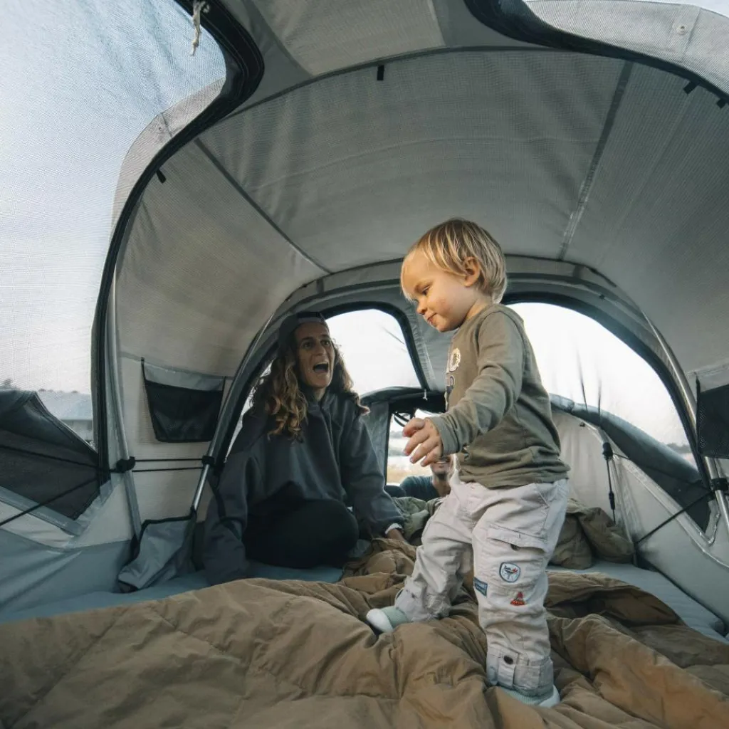Am Stellplatz lässt sich das Dachzelt in nur wenigen Minuten zu einem gemütlichen Schlafplatz entfalten. So bleibt mehr Zeit zum Ankommen, Abschalten oder um frische Luft ins Zelt zu lassen.