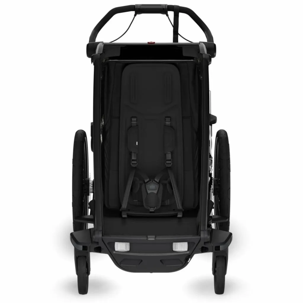 Was ihn von den anderen Thule Kindertransportern unterscheidet, ist vor allem die effektive, von Hand bedienbare Scheibenbremse, die den Chariot Sport 2 Single absolut geländetauglich macht, sowie der komfortable, gut ventilierte Innenraum mit Komfort-Sitz. Zwei Lüftungsöffnungen unterhalb der Frontrückstrahler sorgen für den angenehmen Luftaustausch während der Fahrt.