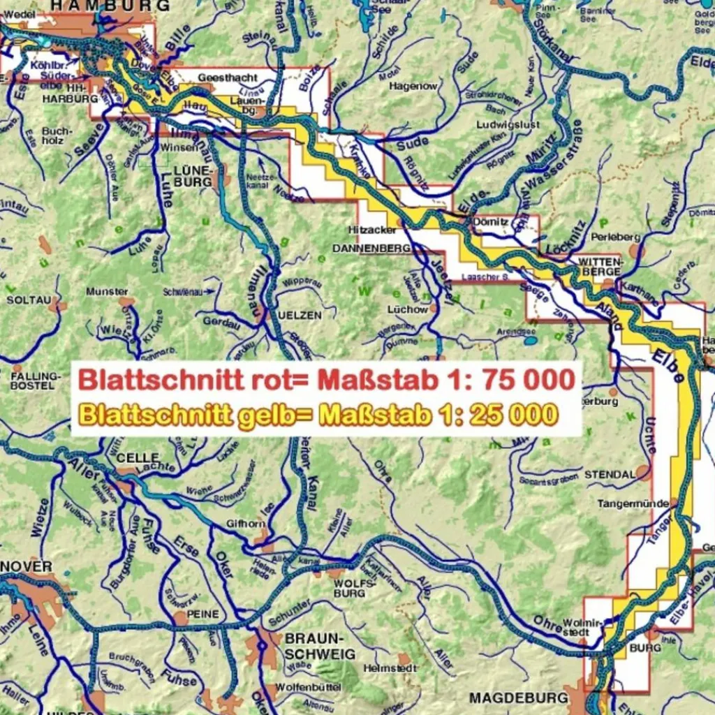 Dieser Atlas bieten alle Informationen, die sowohl Wasserwanderer als auch Radfahrer unterwegs benötigen: Gewässer-km, Anlande- u. Befahrungsverbote, Rast- und Biwakplätze, Liegeplätze, Slip-, Ein- und Ausstiegsmöglichkeiten, Betonnung, Brückenhöhen, Anschriften- und Ausstattungsliste der Vereine und Campingplätze, und eine Kartendarstellung, die nicht hinter’m Deich aufhört, also auch für Landausflüge bestens geeignet. Für Radler ist selbstverständlich der offizielle Radweg dabei, aber auch Alternativrouten, schlechte Wegstecken, Steigungen, Quartiere, Bäcker, Lebensmittelgeschäfte, Restaurants, Sehenswürdigkeiten.