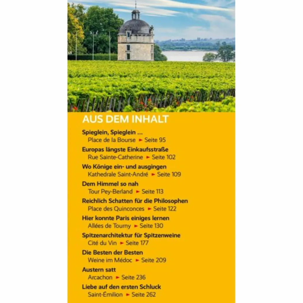 Kunst- und Kulturbegeisterte, Feinschmecker und Freunde des bunten Lebens ‒ alle schwärmen von Bordeaux, dem »Paris des Südens« . Der imposante Place de la Bourse, die gotische Kathedrale Saint-André, das Grand Théâtre und eine Fülle weiterer barocker und klassizistischer Gebäude machen das historische Zentrum zum Gesamtkunstwerk. Seit 2007 trägt es den UNESCO-Welterbetitel. Erstklassige Museen wie das Musée des Beaux-Arts oder das Musée d’Art Contemporain hüten das reiche Kulturerbe. Vergangenes strahlt in neuem Glanz, darunter die Bassins des Lumières, im Zweiten Weltkrieg düstere deutsche U-Boot-Basis und heute weltweit das größte Zentrum für digitale Kunst. Und Neues wurde geschaffen, wie die Cité du Vin, die mit spektakulärer Architektur auf zehn Etagen den Wein feiert. Stolz und Markenzeichen des Bordelais.