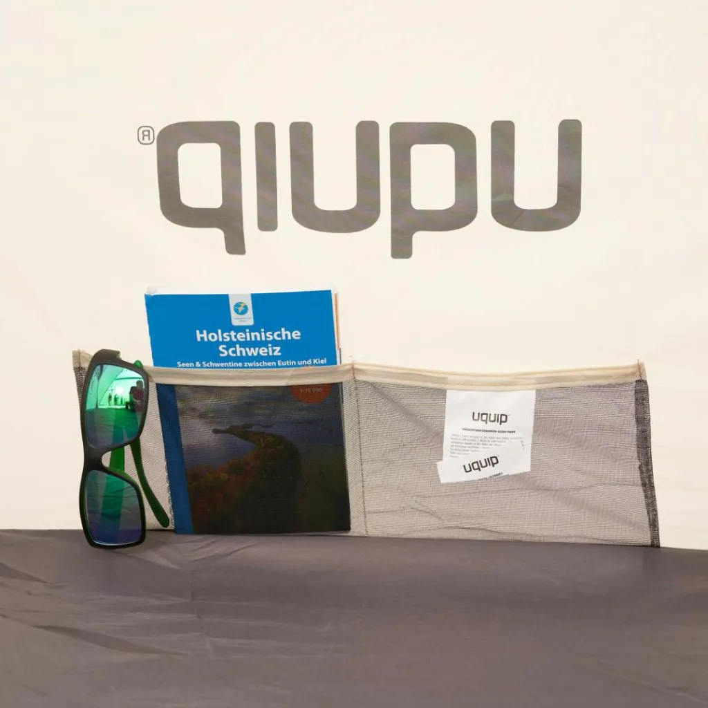 Möchtest du ins Wasser springen, kannst du den Eingang mit der Bodenplane verschließen. So liegen die Sachen sichtgeschützt im Innern der Strandmuschel. Seitlich angebrachte Taschen können derweil mit Sand oder Steinen gefüllt werden, damit Speedy nicht vom Wind davongetragen wird.