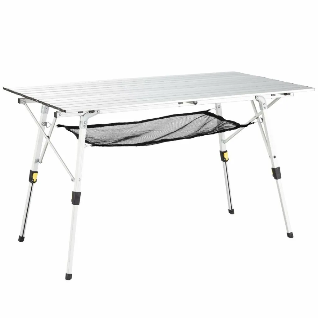 Dieser höhenverstellbare Aluminium-Falttisch bietet bis zu sechs Personen Platz. Die Tischplatte wird zur kurzen Seite gefaltet, wodurch das Packmaß sehr gering ist.