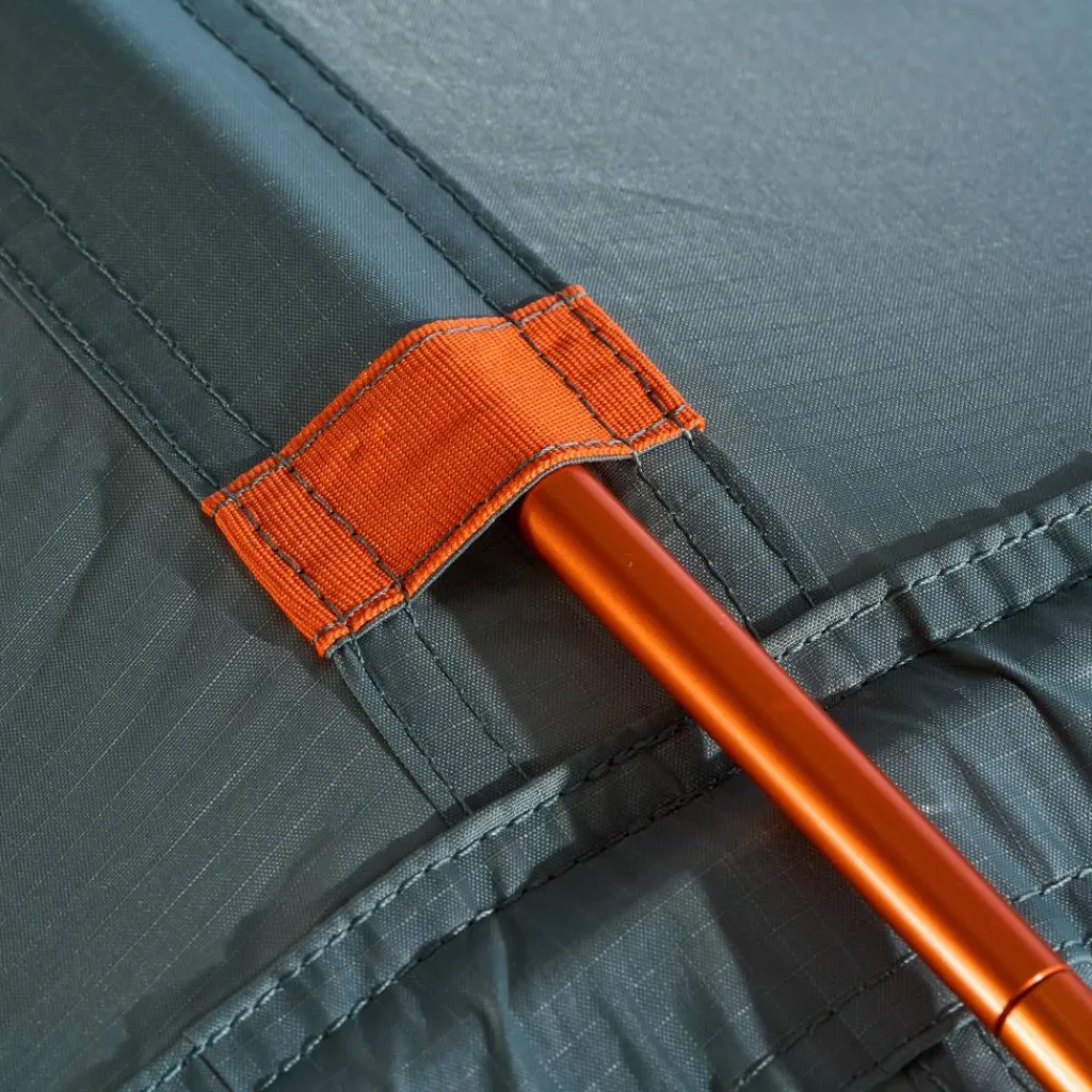 Das Zelt wird mit nur zwei Stangen aufgestellt. Der kombinierte Aufbau von Innen- und Außenzelt sowie die durchgehenden Gestängekanäle erleichtern das Aufstellen. Dadurch bleibt das Innenzelt selbst beim Aufbau im Regen trocken.