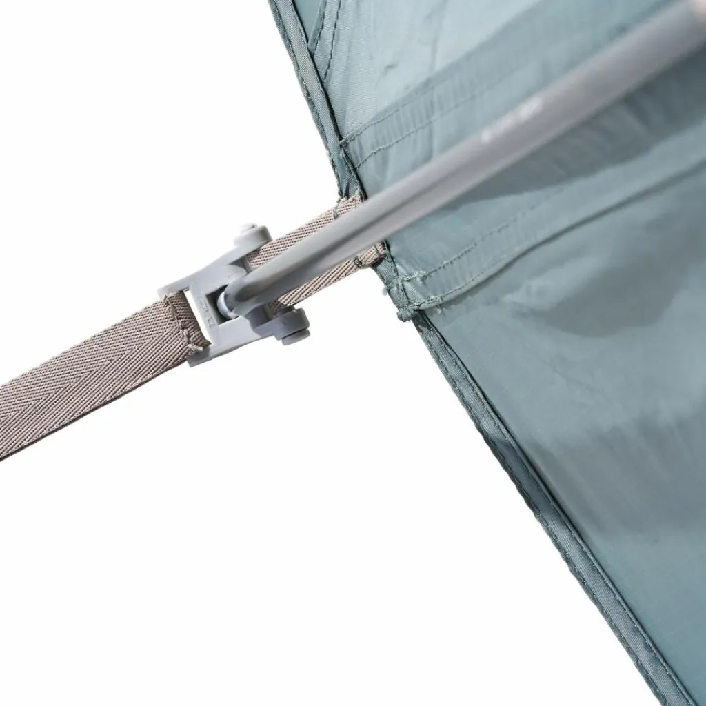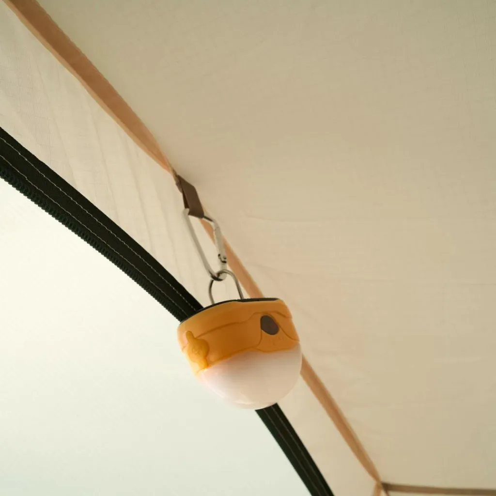 Die Kuppelkonstruktion wiegt rund 2500 Gramm und ist damit leicht genug, um sie auf Wanderungen und anderen Outdoor-Aktivitäten mitzunehmen. Als Trägerkonstruktion kommen zwei hochwertige, 8,7 mm dicke Aluminiumgestänge des Marktführers DAC zum Einsatz. Zusammen mit sieben Zeltleinen und vier umlaufenden Abspannpunkten wird das Zelt sicher im Boden verankert. So musst du dir auch bei kräftigem Wind keine Sorgen um die Haltbarkeit machen.