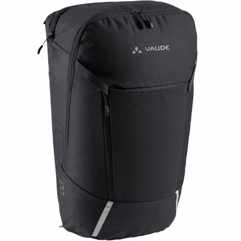 Die Cycle 20 II wird über die mit einem Schloss absperrbaren QMR-Haken (z. B. Abus 145/20, nicht im Lieferumfang enthalten) am Gepäckträger befestigt und ist im Handumdrehen zum Rucksack umgebaut. Dazu werden die beiden vertikalen Reißverschlüsse geöffnet und das gesamte Befestigungssystem in einem mit Klett verschlossenen Fach verstaut. Die Umbaufunktion wird auf einem eingenähten, leicht entfernbaren Etikett in wenigen Schritten erläutert. Die clevere Rucksack-Radtaschen-Kombination bietet aber noch mehr. Im großen Hauptfach mit Platz für DIN A4 Unterlagen hilft ein mit Reißverschluss zu schließender Netz-Organizer für Kleinutensilien dabei, Ordnung zu halten. Ein separates, mit Reißverschluss verschlossenes, gepolstertes Fach nimmt Laptops bis 15,6 Zoll auf. Auf der Front befindet sich eine flache Netztasche für das schnelle Verstauen von Zeitschriften oder nasser Kleidung. Ein Helmhalter sowie ansprechend ins Design integrierte reflektierende Elemente runden die Komfortausstattung ab. Das Hauptmaterial des Cycle besteht aus 50 % recyceltem Polyester, das Kontrastmaterial sogar zu 100 %. Unser Verwandlungskünstler ist mit EcoFinish PFC-frei wasserabweisend ausgerüstet. Das VAUDE Green Shape-Label steht für ein umweltfreundliches, funktionelles Produkt aus nachhaltigen Materialien.