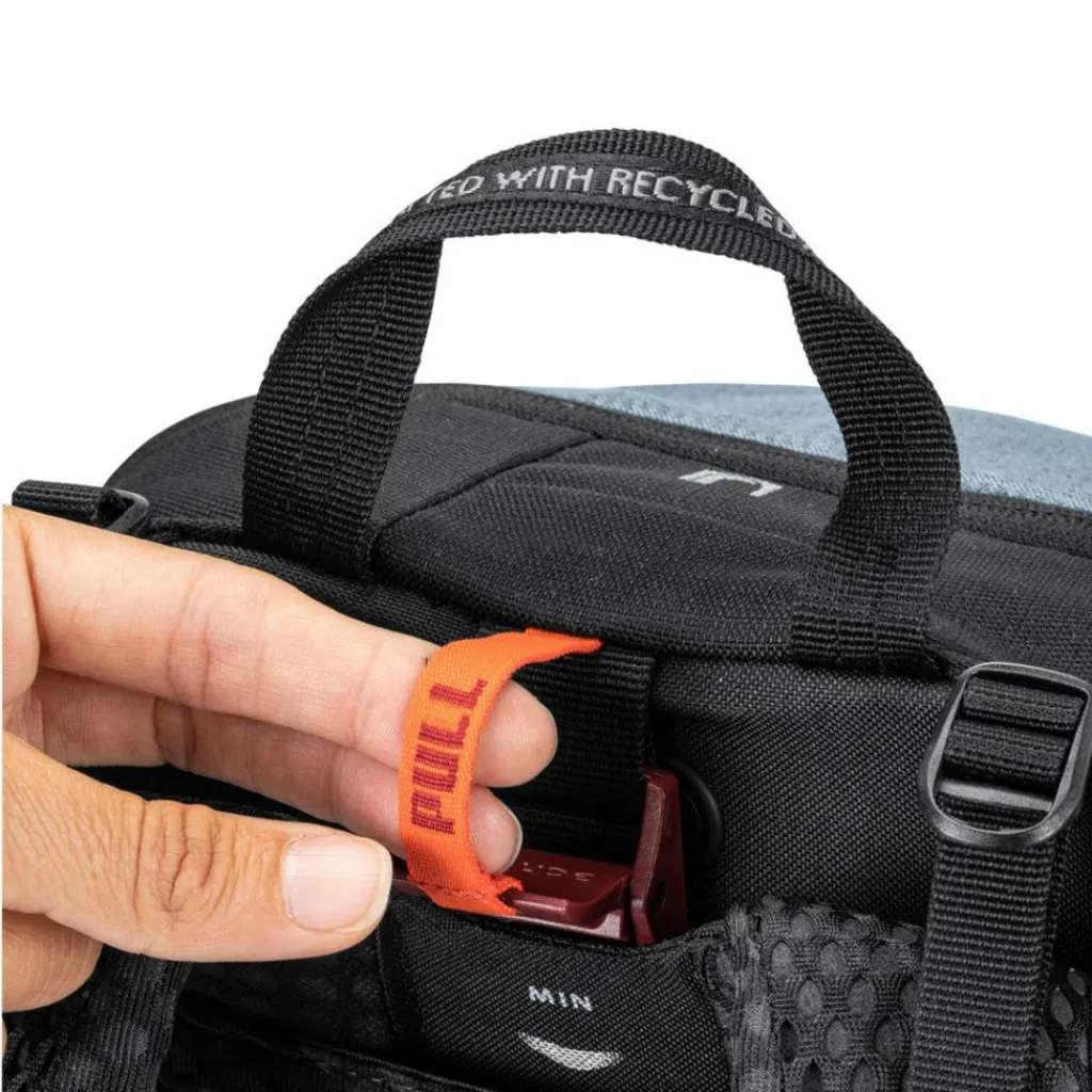 Zur Ausstattung gehören darüber hinaus elastische Seitentaschen, ein separates Trinkblasenfach, Kompressionsriemen im Seitenbereich, ein Loop auf dem Träger für die Sonnenbrille und eine Regenhülle, die sich im separaten Bodenfach des Rucksacks befindet. Das bluesign-zertifizierte, recycelte Material des Moab Control 20 Mountainbike Rucksacks ist mit Eco Finish umweltfreundlich wasserabweisend ohne Fluorcarbone (PFC) hergestellt. Das VAUDE Green Shape-Label steht für ein umweltfreundliches, funktionelles Produkt aus nachhaltigen Materialien.