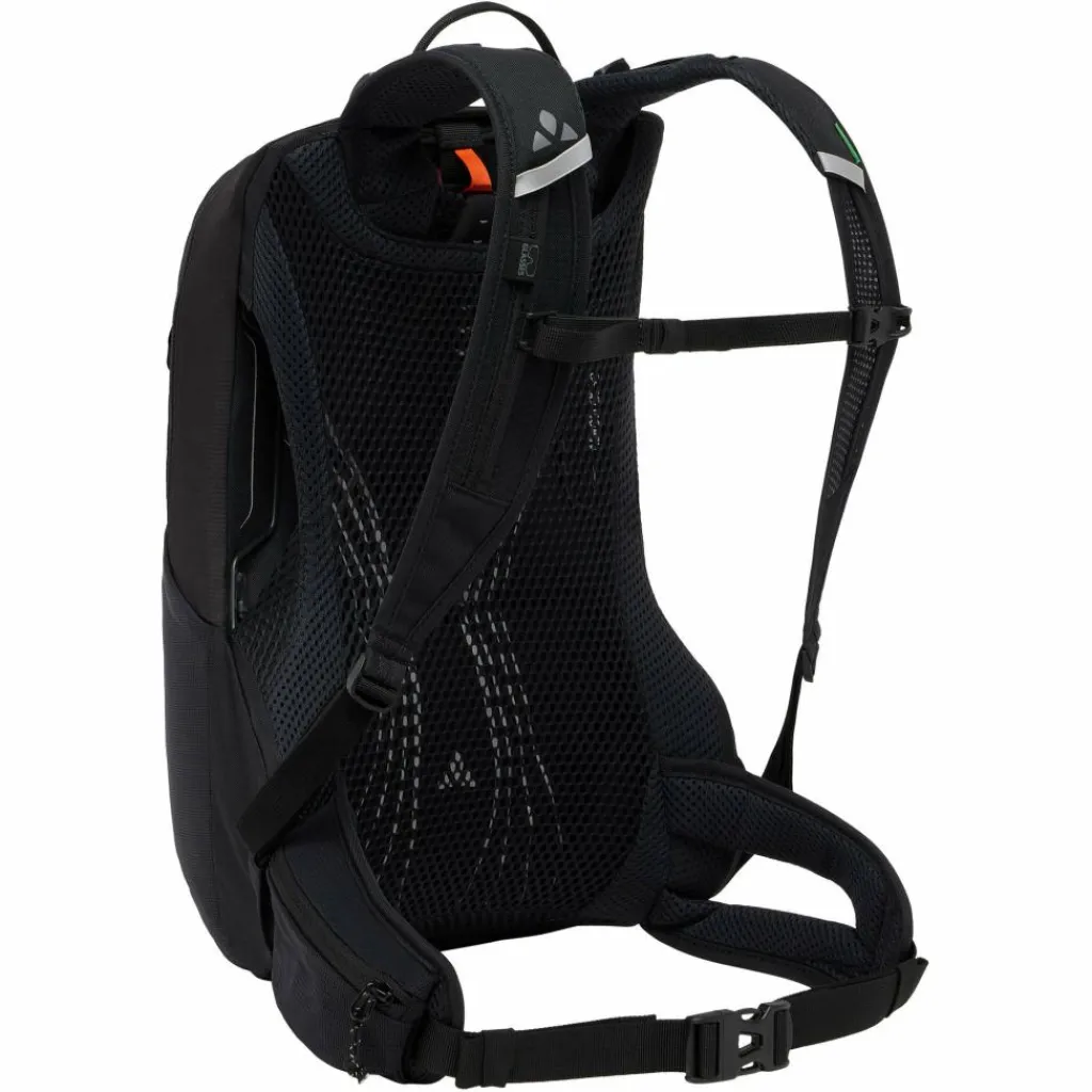 Das Aeroflex 3D Tragesystem sorgt für ausgezeichneten Tragekomfort und optimale Belüftung am Rücken. Die ergonomisch geformten, gut gepolsterten Träger lassen sich mit der Shifting Back Length nahtlos auf jede Rückenlänge anpassen. Der gepolsterte Hüftgurt hat auf der rechten Seite eine kleine Reißverschlusstasche. Der Brustgurt mit Schlauchhalter, eine Helmhalterung auf der Front, ein Blinklichthalter, eine im Bodenfach untergebrachte Regenhülle und große Reflexelemente komplettieren die Komfortausstattung des Fahrradrucksacks. Der Trailvent 10 Liter Fahrrad Rucksack ist mit Eco Finish PFC-frei wasserabweisend ausgerüstet.