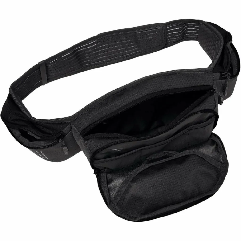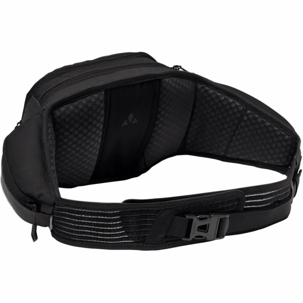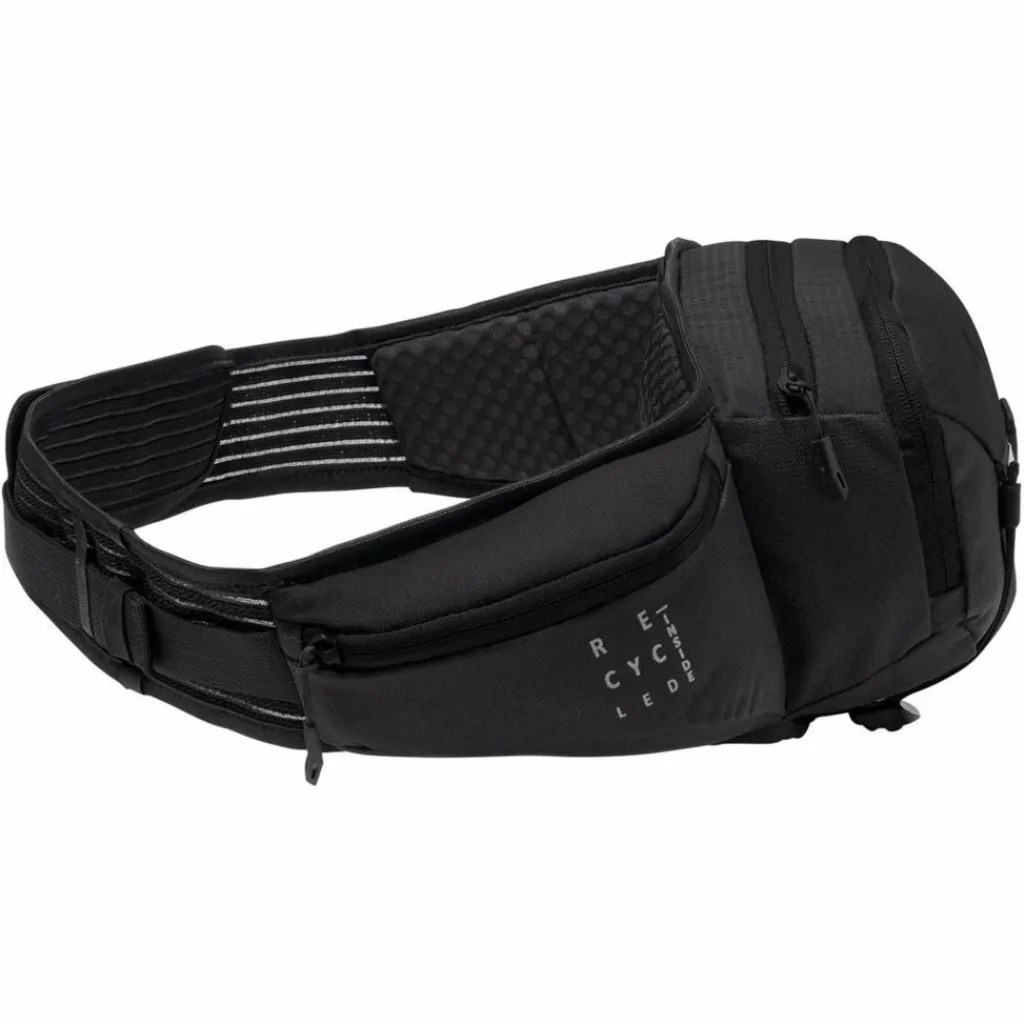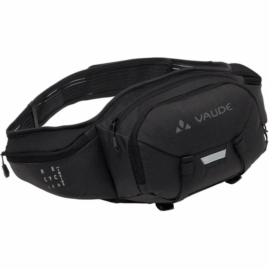 Das hintere Fach bietet über die komplette Breite genügend Platz für Regenjacke und Ersatzschlauch. 2 kleine, mit Reißverschluss verschlossene Seitentaschen schmiegen sich perfekt um den Hüftbereich und verwahren Minitool, Handy oder Riegel. Ein auf die Front aufgesetztes Fach ermöglicht gute Organisation des Werkzeugs. Am Boden der sportlichen Hüfttasche lassen sich sowohl eine Minipumpe als auch vor der Ausfahrt Protektoren befestigen. Eine Regenhülle für Schutz vor Schauern und Schmutz sowie ein reflektierender Webbingloop und das reflektierende Vaude Logo runden dieses Komfortpaket mit 3 l Volumen ab.