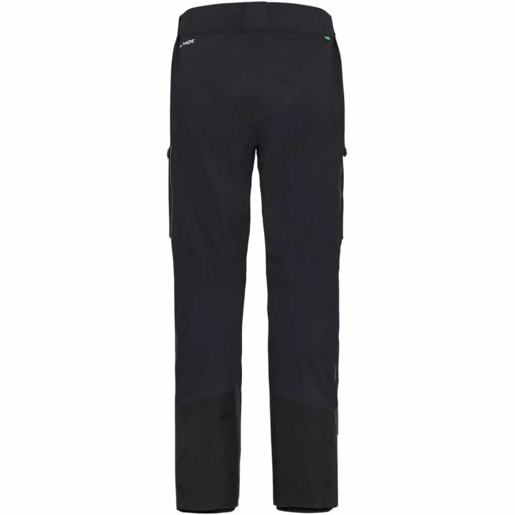 Der Bund ist weitenverstellbar und mit Gürtelschlaufen versehen, der Rückenteil etwas höher geschnitten, damit auch mit angezogenen Beinen am Fels oder in gebückter Haltung keine Kältebrücke entsteht. Die beiden Beintaschen mit wasserdichtem Reißverschluss verwahren Handy, Mütze oder den Müsliriegel und sind auch bei angezogenem Klettergurt gut erreichbar. Der Beinabschluss ist großzügig mit robustem, schnittfestem Material verstärkt, die Innengamaschen schützen vor eindringendem Pulverschnee bei der Abfahrt und die Verstellung am Beinabschluss passt über jeden Skitourenstiefel.