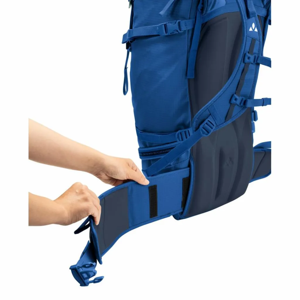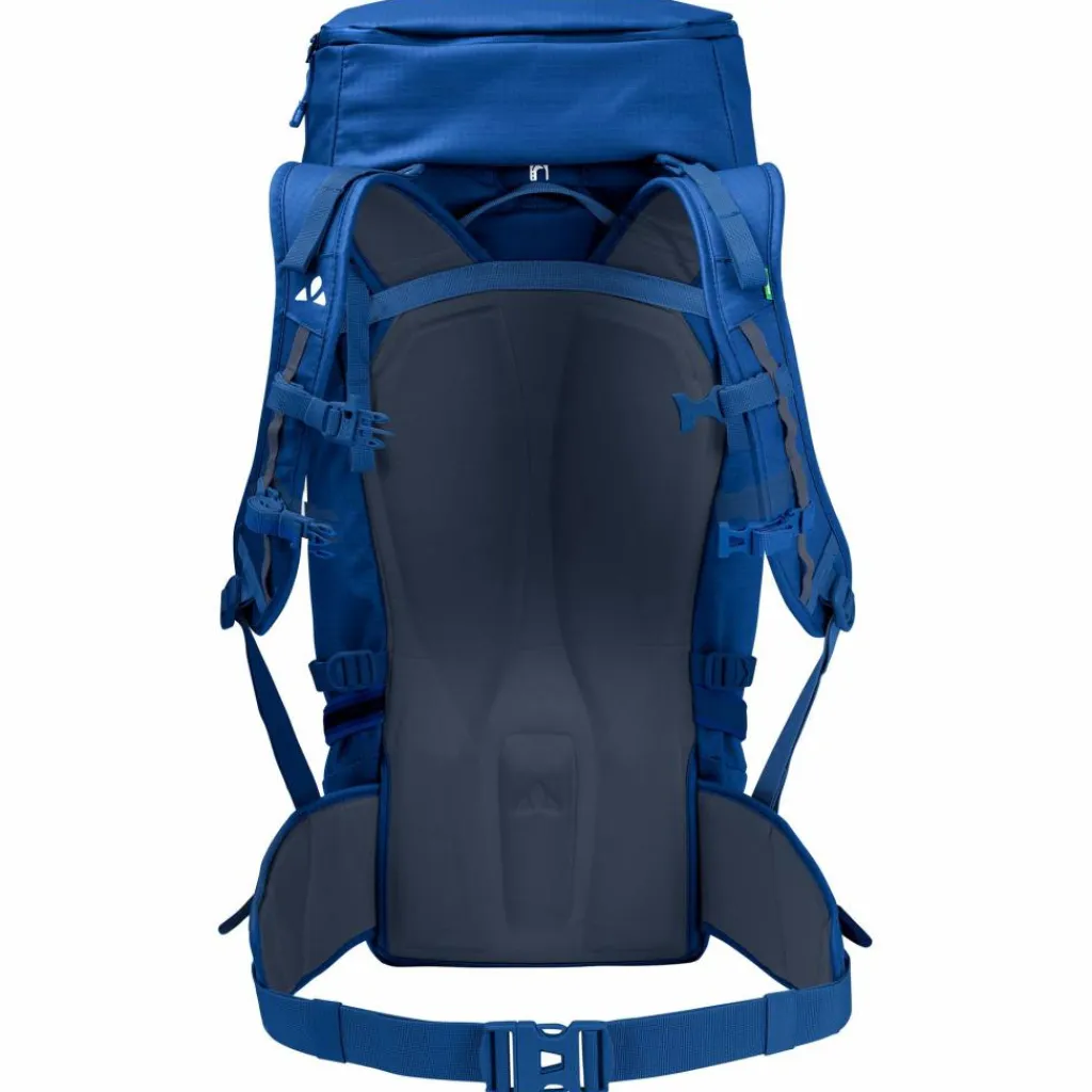Die ergonomisch geformten Schulterträger bieten in der FoM-Variante (Freedom of Movement) einen uneingeschränkten Bewegungsradius – auch über Kopf wie z.B. beim Klettern. Dafür sorgen zwei separat einstellbare und abnehmbare Brustgurte, die die Träger bei Bedarf weit nach innen ziehen und so das Schultergelenk maximal freigeben. Der Alurahmen lässt sich anpassen oder herausnehmen. Unter dem höhenverstellbaren Deckel (etwa 5 l Extra-Volumen) verbirgt sich die Seilhalterung. Außen am Alpinrucksack lassen sich zwei Eisgeräte und der Helm befestigen. Seitliche Holster und die Kompressionsriemen geben Ski oder Trekkingstöcken Halt. An zwei Gurtbänder mit Schlaufen kann weitere Ausrüstung fixiert werden.