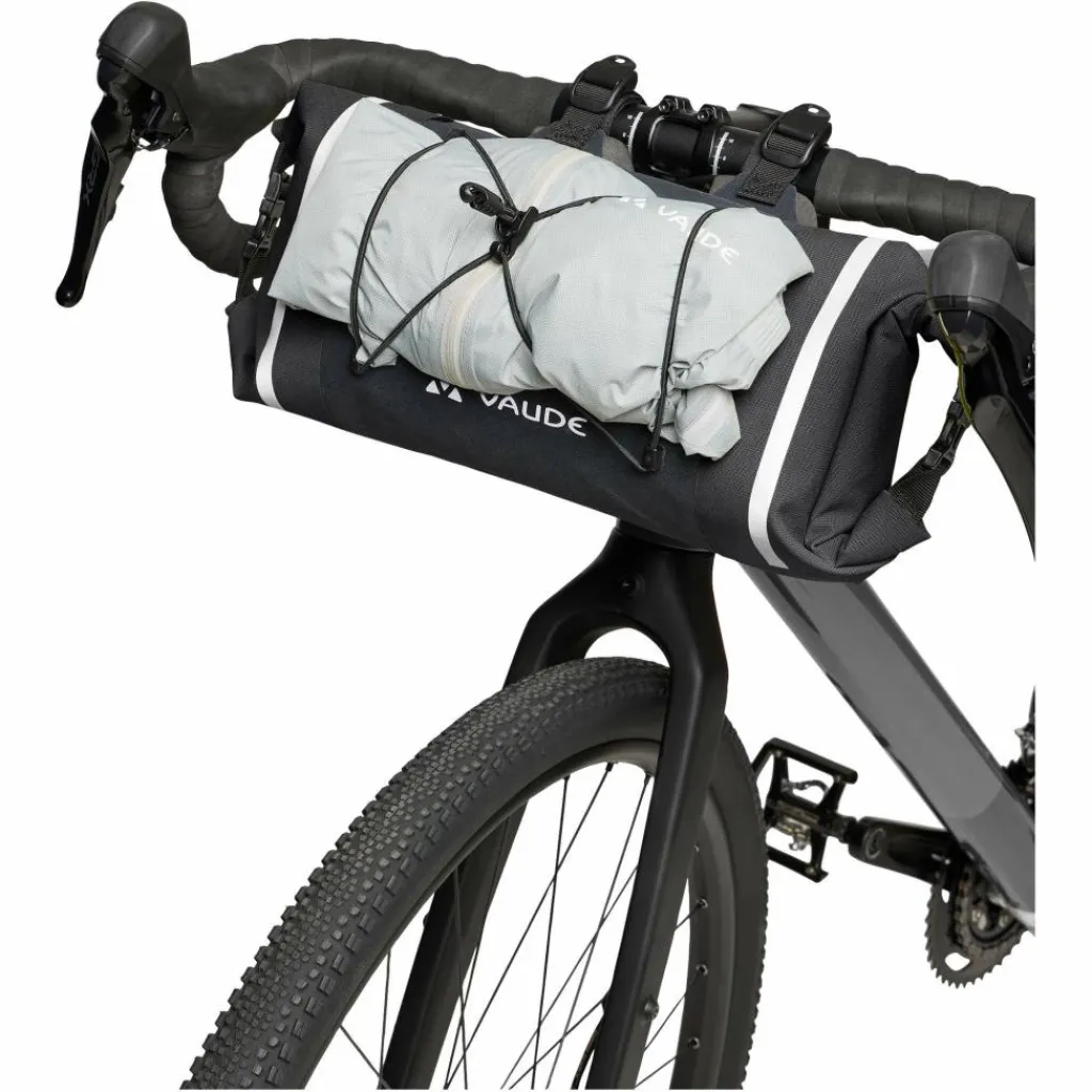 Die wasserdicht verschweißte Lenkerrolle Trailfront Compact sorgt für ein unbeschwertes Touren-Wochenende. Die Lenkerrolle mit 6,2 Litern Volumen ist von beiden Seiten zugänglich und über Wickelverschlüsse wasserdicht komprimierbar und eignet sich hervorragend für leichtes Gepäck oder einen Schlafsack. Über Packriemen auf der Oberseite kannst du zusätzliches Gepäck und sogar ein Zelt außen befestigen. Die Klettfixierungen machen ein schnelles, dabei sehr stabiles Anbringen am Lenker möglich. Die variabel einstellbare Elastikkordel hält alles fest, was schnell greifbar sein soll.