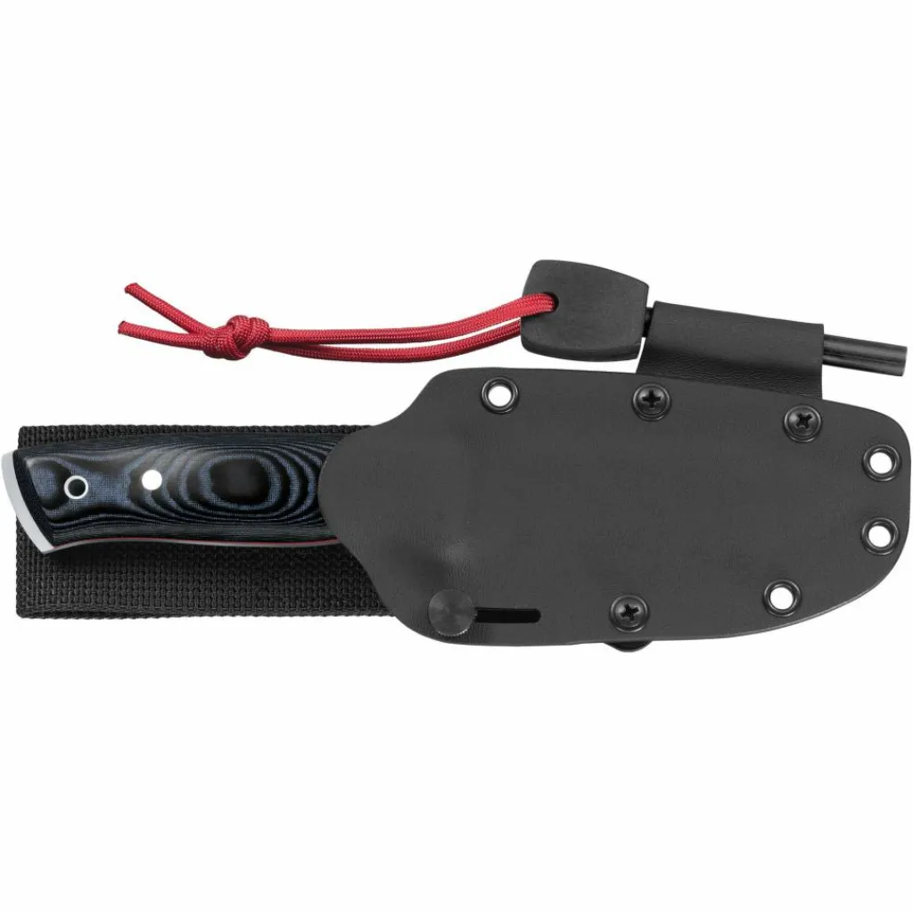 Mit bewährter und scharfer Klinge aus 4116 Stahl, Tek-Lok kompatibler Kydex-Scheide und geschärftem Klingenrücken, um Funken mit dem beiliegenden Feuerstahl zu erzeugen.