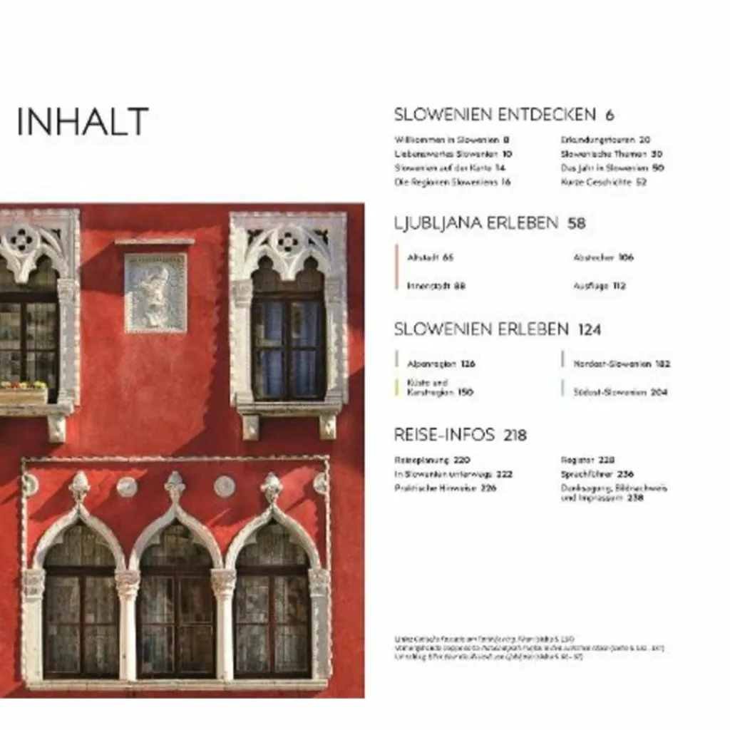 – Ausgewählte Top-Themen: Auf den bildgewaltigen Themenseiten des Slowenien-Reiseführers stehen charakteristische Besonderheiten im Fokus. Entdecken Sie Sloweniens abwechslungsreiche Architektur oder die Köstlichkeiten der slowenischen Küche. Auch Outdoor-Abenteurer, Kunstfans und Naturliebhaber kommen hier voll auf ihre Kosten.