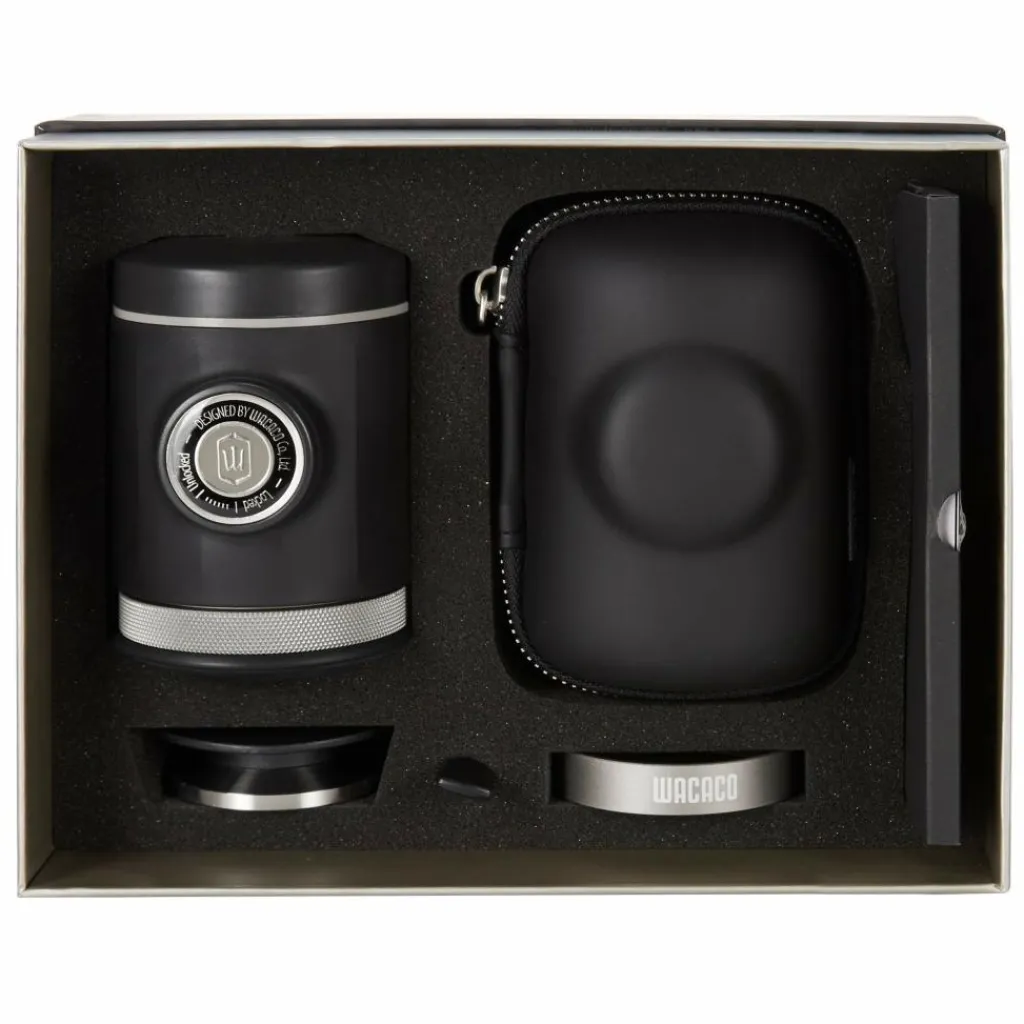 Eine Picopresso besteht aus: Wassertankdeckel, Trichter, Wassertank, Hauptkörper, Kolben, Auslaufdusche, Doppelfilterkorb, Siebträger, Siebträgerkopf, Siebträgerabdeckung. Hinzu kommen Zubehörteile wie Tamper, Messbecher, Verteilwerkzeug, Bürste. Alle Teile (inkl. Zubehör) werden kompakt im Gerät aufbewahrt und nehmen somit nur die winzigen Maße von 10,6 x 7,8 cm an. Um das edle Gerät beim Transport bestmöglich zu schützen, kannst du es im mitgelieferten Etui verstauen.