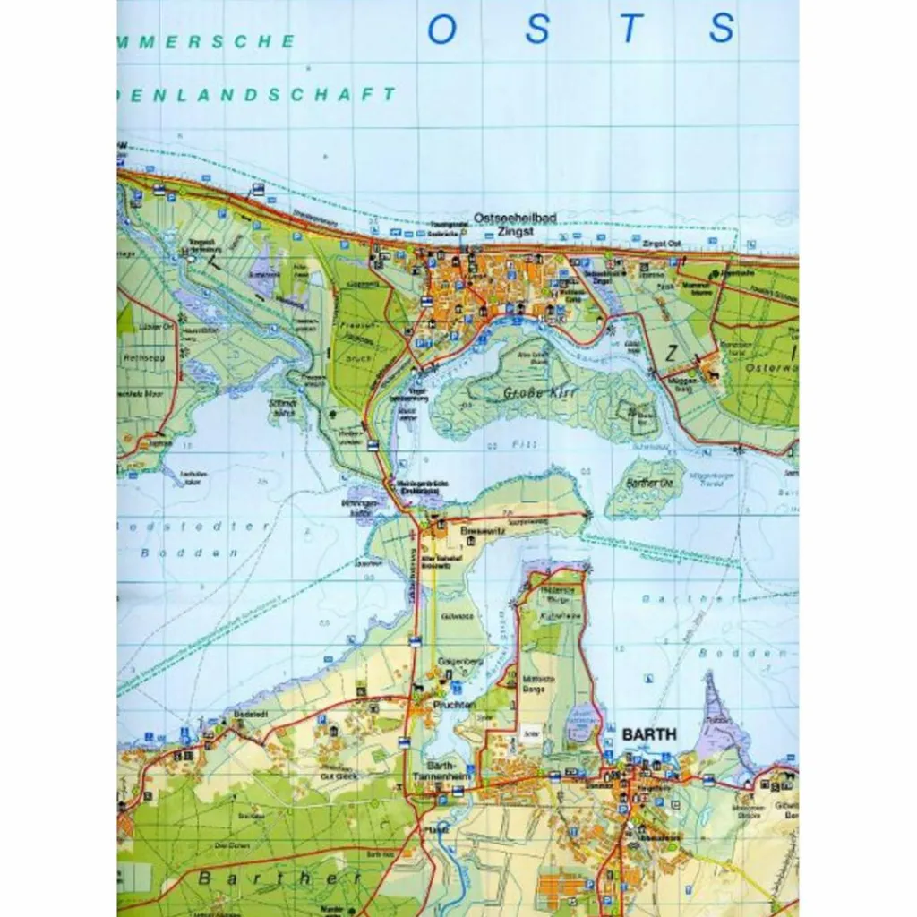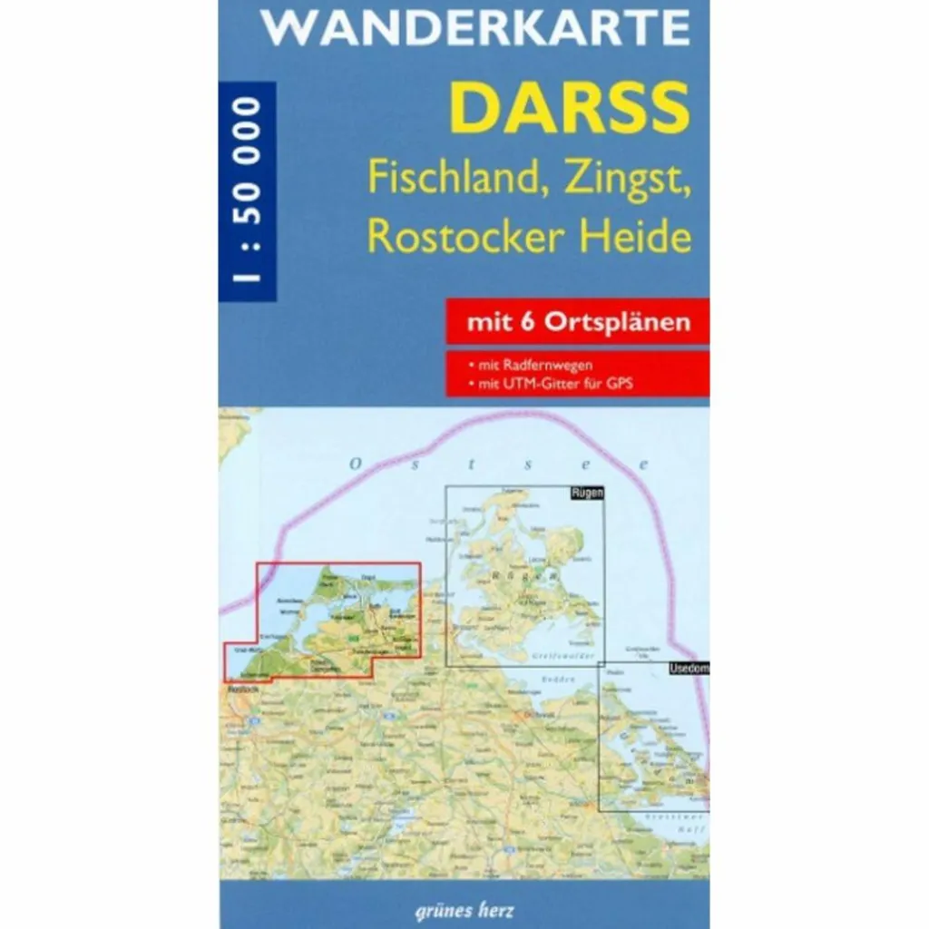 Die Karte zeigt die komplette Halbinselkette Fischland, Darß, Zingst mit der Boddenlandschaft, die Rostocker Heide sowie das Recknitztal. Sie beschränkt sich nicht nur auf die Küstenregionen, sondern stellt auch das interessante Landesinnere dar. Die topographische Wanderkarte (M 1:50.000) enthält das Wanderwegenetz mit Markierungszeichen sowie die Radfernwege. Spezielle Symbole widerspiegeln die touristischen Besonderheiten und Leistungsangebote. Die Kartenrückseite enthält Ortspläne mit Straßenregister der Ostseebäder Ahrenshoop, Dierhagen, Graal-Müritz, Prerow, Zingst und Wustrow. Gleichzeitig gibt sie kurze Erläuterungen zu besuchenswerten Orten und Plätzen, die durch Fotos ergänzt werden. Die Karte wurde auf speziellem Landkartenpapier gedruckt. Das engmaschige UTM-Gitter erleichtert die GPS-Navigation.