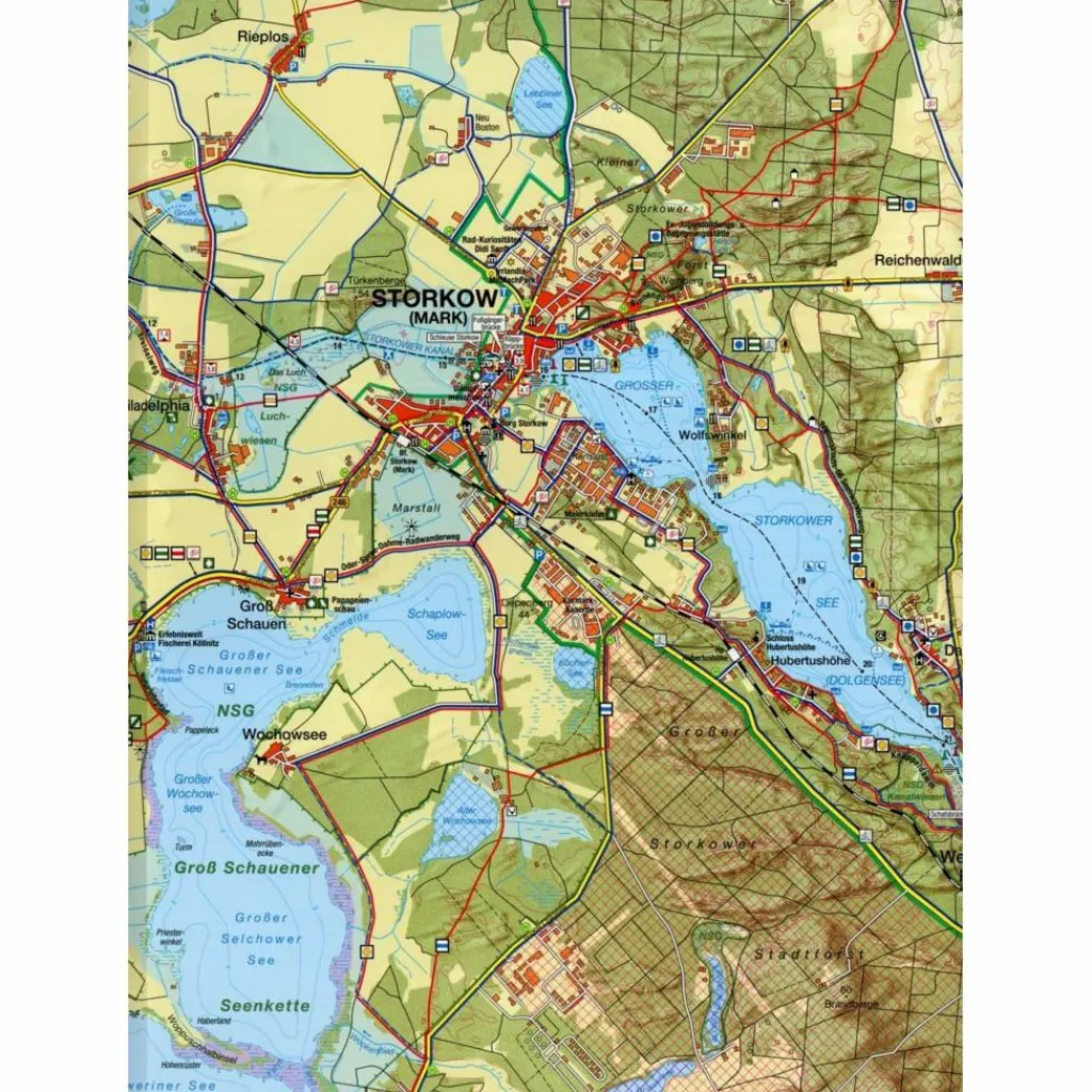 Die Rad-, Wander- und Gewässerkarte „Storkower Gewässer, Scharmützelsee“ wurde wasser- und reißfestem sowie recyclingfähigem Material gedruckt. Sie stellt die Region im Maßstab 1:35.000 dar und ist 48 x 68 cm groß. Der Scharmützelsee, die Storkower Gewässer und der Wolziger See bilden das Zentrum der Karte. Der Kartenausschnitt reicht von der BAB 12 und den Rauener Bergen im Norden bis zum Springsee und Ahrensdorf im Süden, sowie von Blossin im Westen bis nach Alt Golm und Lindenberg im Osten. Das Besondere an dieser Karte ist, dass hierin das Wegenetz für Radler, Reiter, Wanderer und Wasserwanderer gleichermaßen dargestellt wurde. Zugehörige Markierungszeichen finden sich ebenso in der Karte wieder. Die Oberflächen der Radstrecken sind in drei unterschiedlichen Qualitätsstufen dargestellt. Eine wichtige Information für die Wasserwanderer sind die dargestellten Tiefenlinien der Gewässer sowie die Kennzeichnung von gesperrten und befahrbaren Gewässern. Dies ist sehr hilfreich bei der Tourenplanung. Lohnenswerte Ziele und Sehenswürdigkeiten sind durch Symbole gekennzeichnet und entsprechend beschriftet. Die Kartenrückseite stellt die Region in Wort und Bild vor und hält diverse Ausflugstipps sowie Hinweise für Wassersportler parat. Durch die anwenderfreundliche Faltung passt die Rad-, Wander- und Gewässerkarte bequem in das Kartenfach einer Lenkertasche oder die Cargotasche einer Wanderhose.Einladend wirkt die Region zwischen Wolziger See, Storkower Gewässer und dem Scharmützelsee – die wald- und seenreiche Gegend bietet neben Natur pur vielfältige Freizeitangebote. Wie wäre es mit einem Besuch der restaurierten Burganlage in Storkow, einer Wanderung zu dem neuen Aussichtsturm und den benachbarten Hügelgräbern in den Rauener Bergen, einem Segel-Törn auf den Seen, einer Runde Golf oder einfach nur Entspannen in den Kur- und Wellnesseinrichtungen Bad Saarows oder Wendisch-Rietz. Aber auch der Kultur- und Technikinteressierte kommen hier auf ihren Genuss, wie zum Beispiel: die restaurierte Burganlage oder Didis Rad-Museum in Storkow oder das Wettermuseum in Lindenberg.