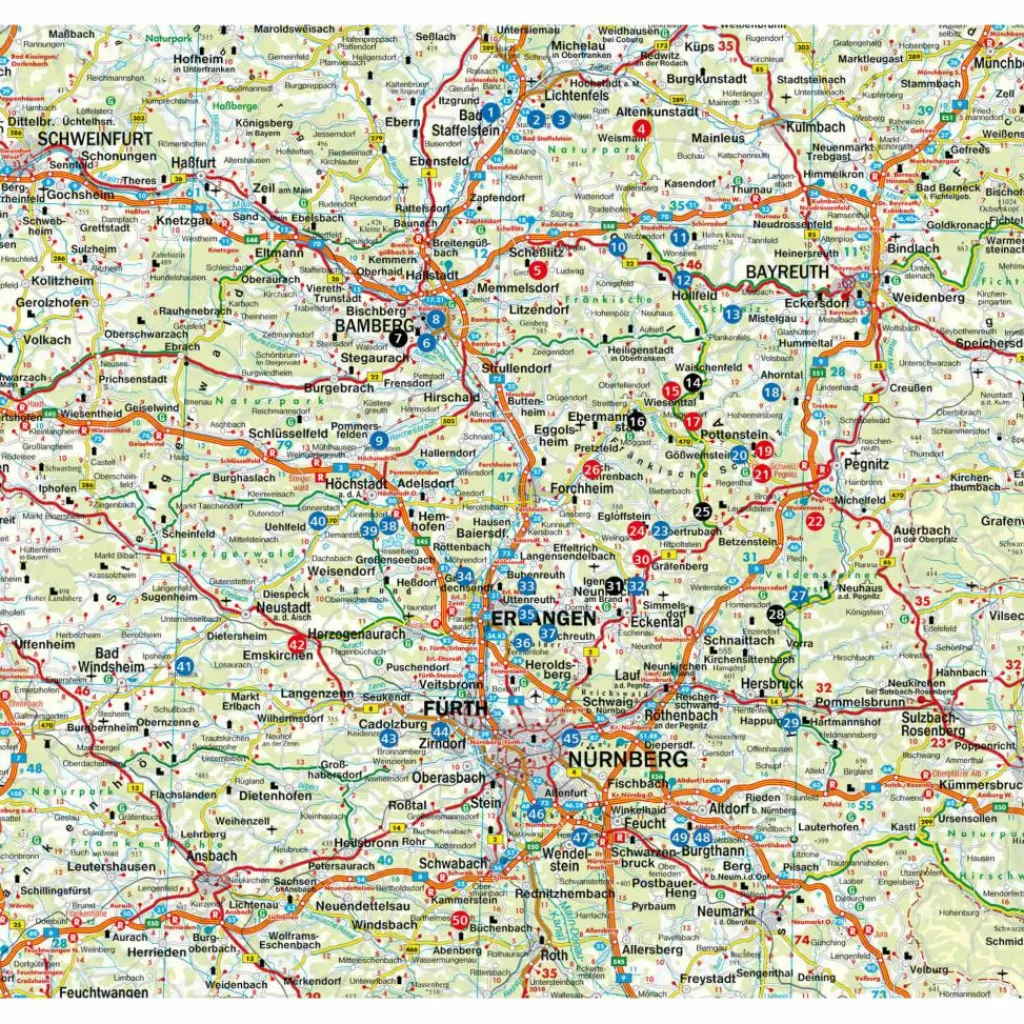 Die Spaziergänge und Wanderungen führen entlang von plätschernden Bachläufen und bunten Wiesen, vorbei an bizarren Felsen und durch autofreie Täler, in denen Schafe und Ziegen weiden. Bei manchen Touren geht es – mit etwas Schubkraft – hinauf zu prächtigen Burganlagen und Schlössern. Auch in den Städten Nürnberg, Erlangen und Bamberg bieten sich hübsche Parks und romantische Altstadt-Gassen zum Schlendern an.