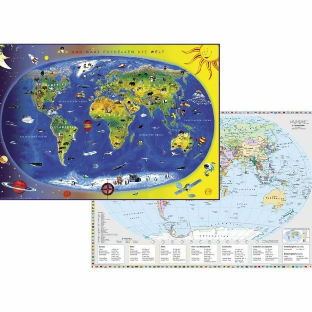 beidseitig bedruckte Schreibunterlage – eingeschweißt – beschreib- und abwischbar – kindgerechte Darstellung der Erde mit Tag- und Nachverlauf – farbenfrohe Gestaltung der Welt mit Sonne, Mond und Sternen – typische Kontinentmerkmale – erstes Entdecken unserer Welt – Kompassdarstellung zum Zeigen der vier Himmelsrichtungen – leicht lesbare Beschriftung der Kontinente und Ozeane in GROSSBUCHSTABEN – politische Weltkarte mit allen Staatsflaggen – Hauptstädte aller Staaten – Basiswissen je Kontinent z.B. größte Stadt, längster Fluss, höchster Berg, Fläche und Einwohnerzahl