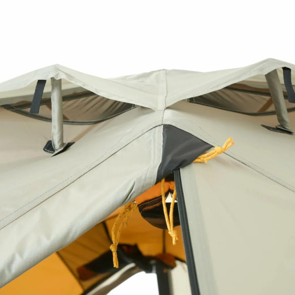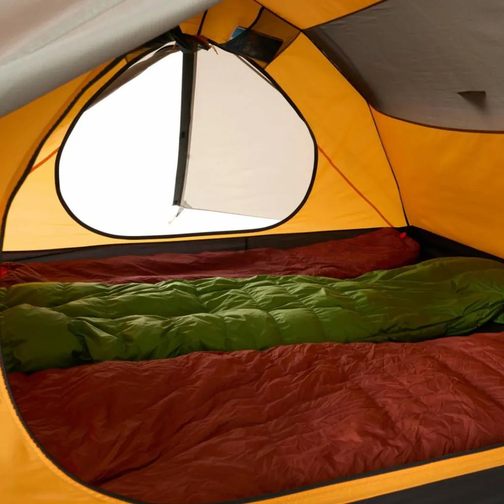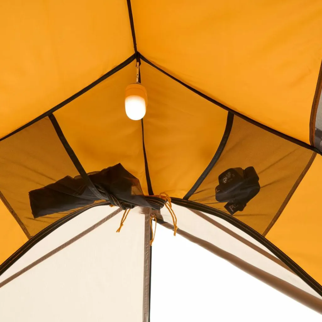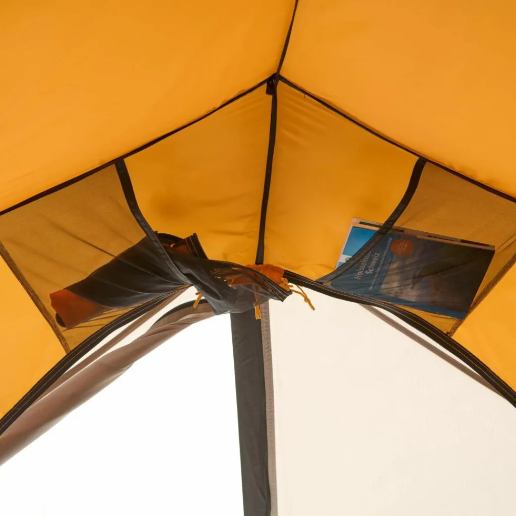 Das Innenzelt bietet ein wohnliches Ambiente. Es hat Platz für bis zu drei Isomatten und sorgt durch das gelbe Innenzeltmaterial für ein warmes Licht. Ausrüstung und Schuhe können in den beiden Apsiden untergebracht werden.