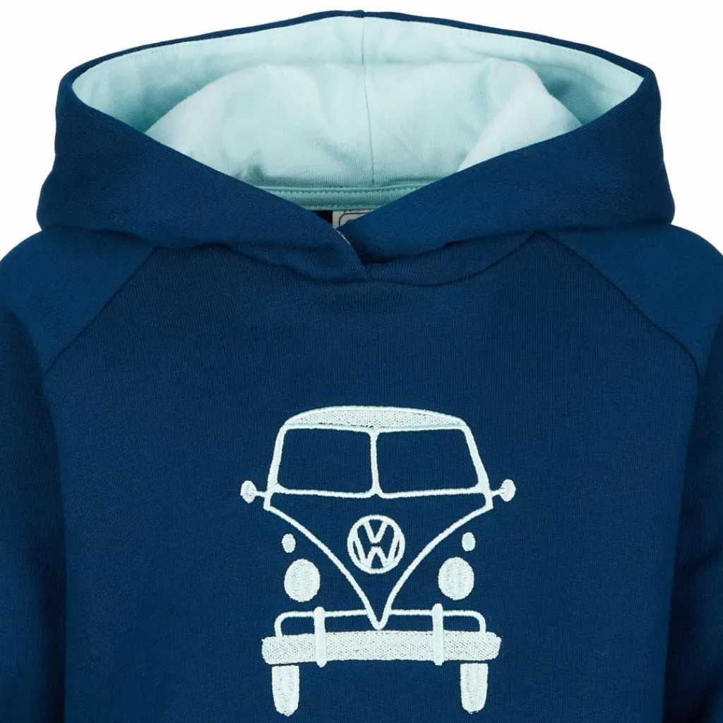 Dank der sanften Naturfaser und dem aufgebürsteten Innenmaterial ist der Sweater schlichtweg megagemütlich und verschönert lange Autofahrten für deine Kinder. Für kleine Nickerchen bietet sich die gemütliche Kapuze an. Sie ist innen mit einer starken Kontrastfarbe versehen, die sich auch in der tollen VW-Bulli Stickerei widerspiegelt.