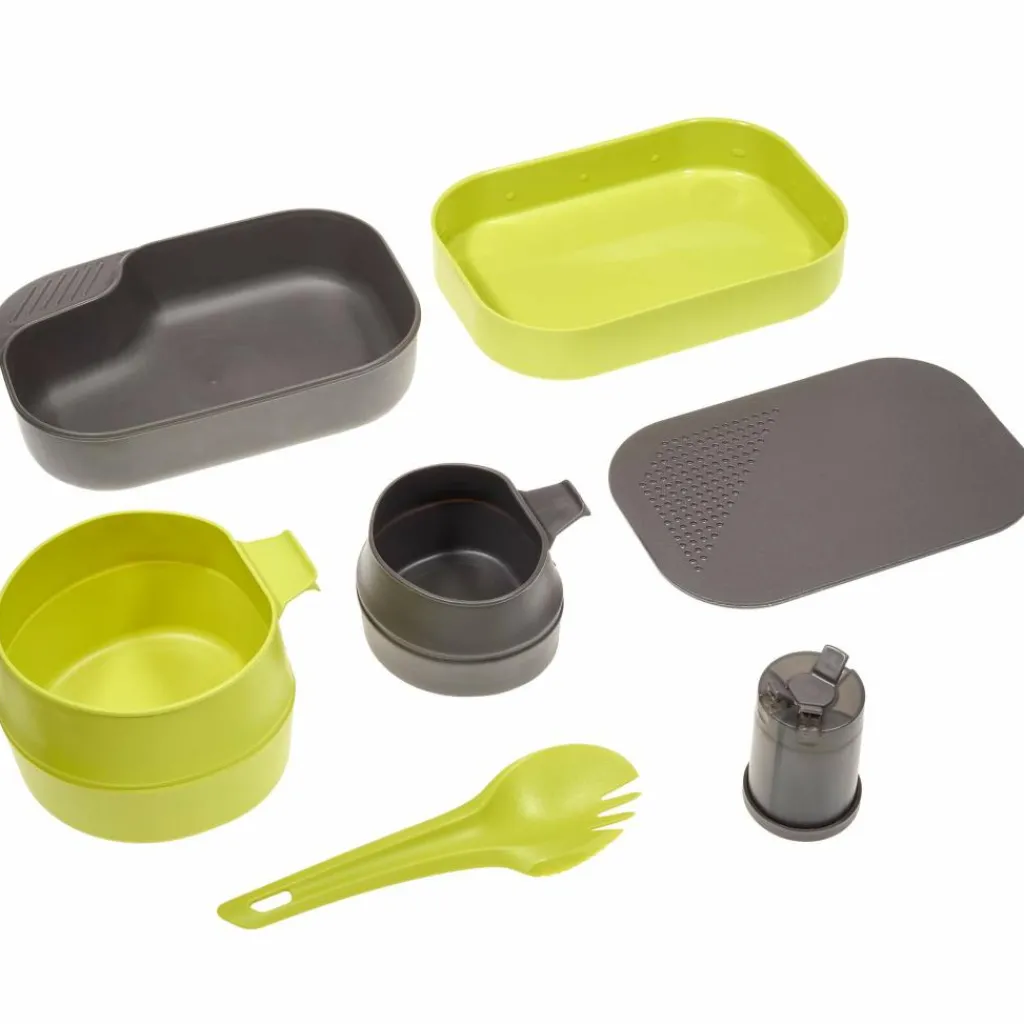 Die 7-tlg. Allround-Brotdose für Pfadfinder: Schüssel, Teller, Tasse und Becher in einem. Dazu sind in der Box ein Schneidbrett mit Siebvorrichtung, ein Gewürzstreuer mit drei Fächern und ein Löffel mit Gabelzinken und Schneidfläche.