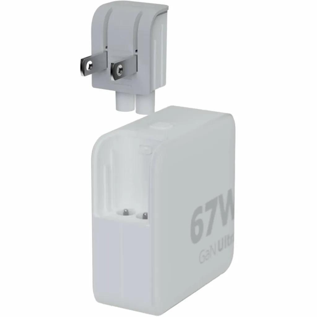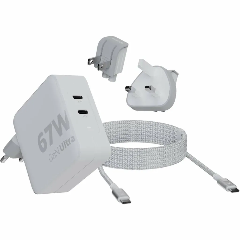 Der Adapter verfügt über zwei USB-C-Anschlüsse mit 20W und 67W. Dadurch kannst du unterwegs neben deinem Notebook gleichzeitig auch dein Smartphone oder Tablet aufladen. Der EU-Stecker kann werkzeugfrei gegen den beiliegenden US- oder UK-Stecker getauscht werden.