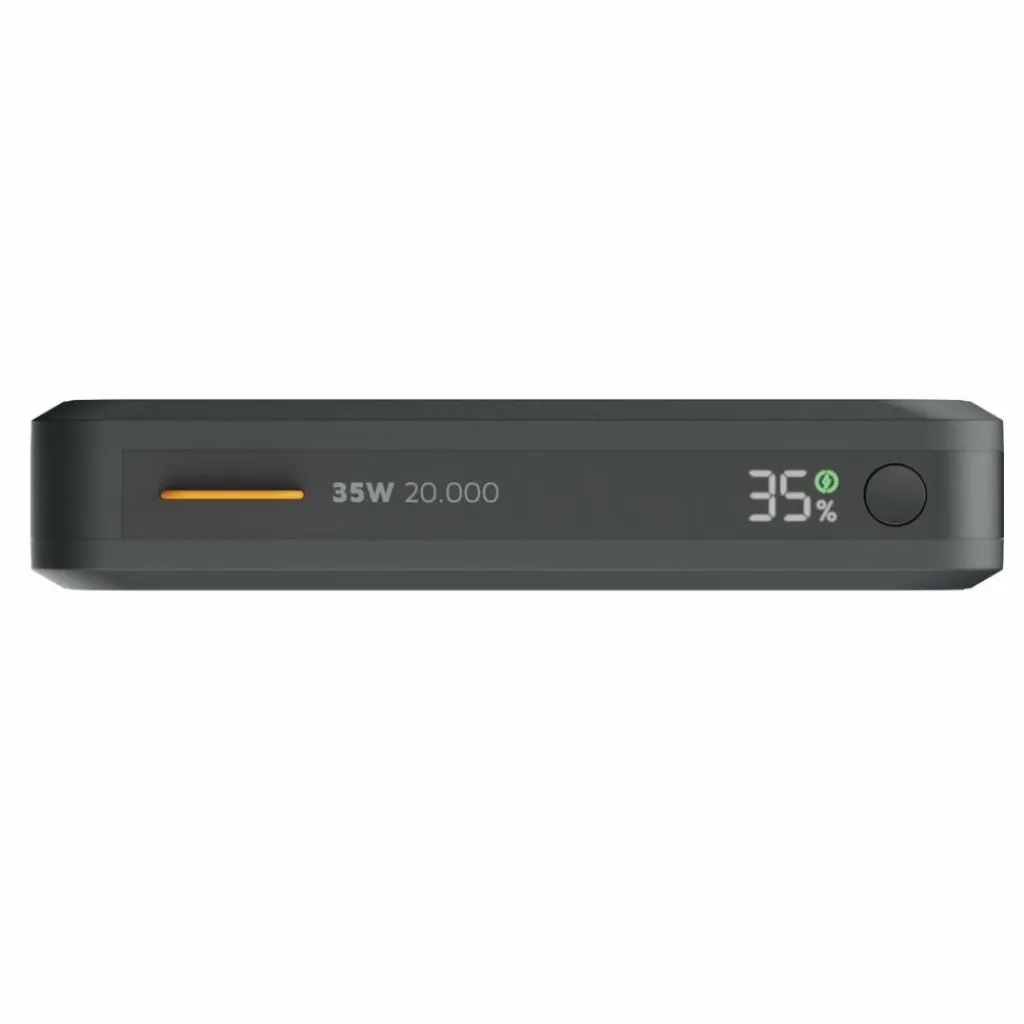 Die handliche Powerbank bietet bis zu 35 W Power am USB-C-Ausgang. Insgesamt stehen drei Anschlüsse zur Verfügung: Neben dem leistungsstarken 35-W-USB-C-PD-Anschluss gibt es einen weiteren 35-W-USB-C-Anschluss und einen 18-W-USB-A-Anschluss. Alle drei Ladeplätze können einzeln oder gleichzeitig genutzt werden.