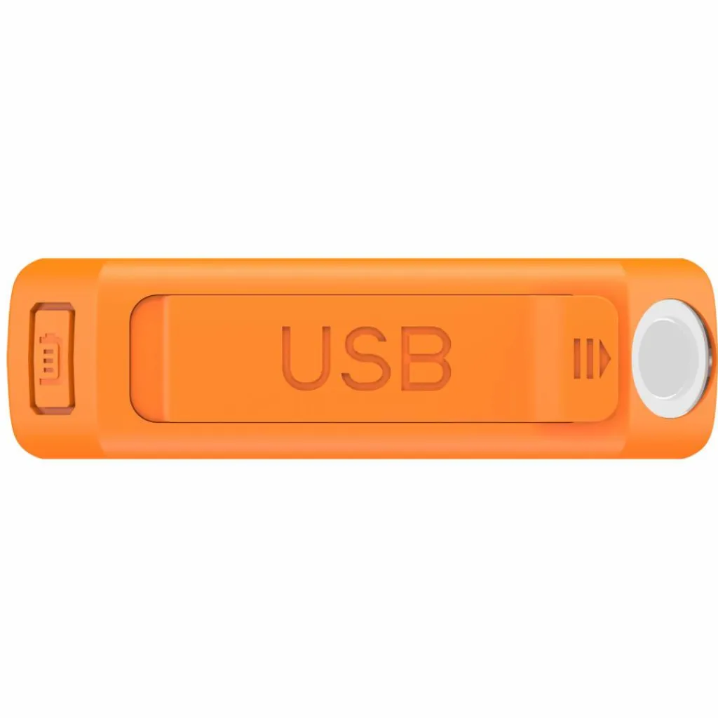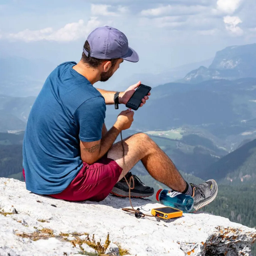 Das Gehäuse besteht aus recyceltem Polycarbonat und ist mit einem TPU-Überzug vor Stößen geschützt. Eine Öse an der Gehäuseecke ermöglicht die Befestigung am Gepäck. Praktisch für Outdoor-Abenteuer: Die integrierte Taschenlampe, die mit einem langen Druck auf die Powertaste aktiviert wird. Sie bietet konstantes Licht mit zur Orientierung im Camp oder Zelt.