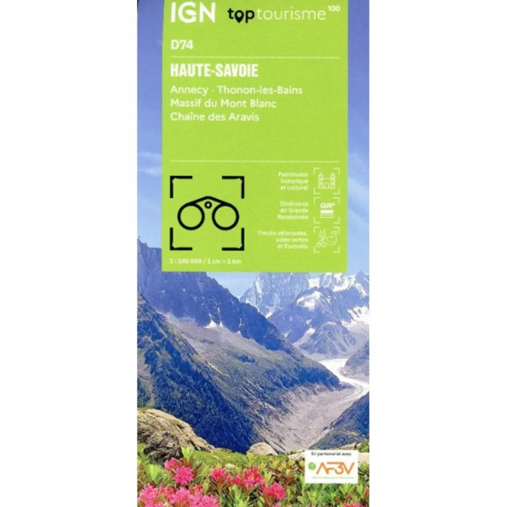 Die neue TOP100 ist dank ihres Maßstabs 1:100.000 (1 cm = 1 km) die ideale Karte, um die Region zu entdecken, sei es zu Fuß, mit dem Fahrrad oder mit dem Auto. Die Velo-Strecken wurden in Zusammenarbeit mit dem Verband AF3V – VéloRoutes et Voies Vertes erstellt.