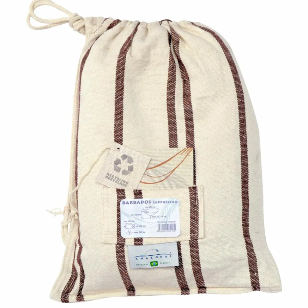 Große Hängematte aus kräftiger Recycling-Baumwolle, angenehm breit zum gemütlichen „Querliegen“, wie in Brasilien üblich. So lässt es sich in der Barbados richtig lange aushalten.