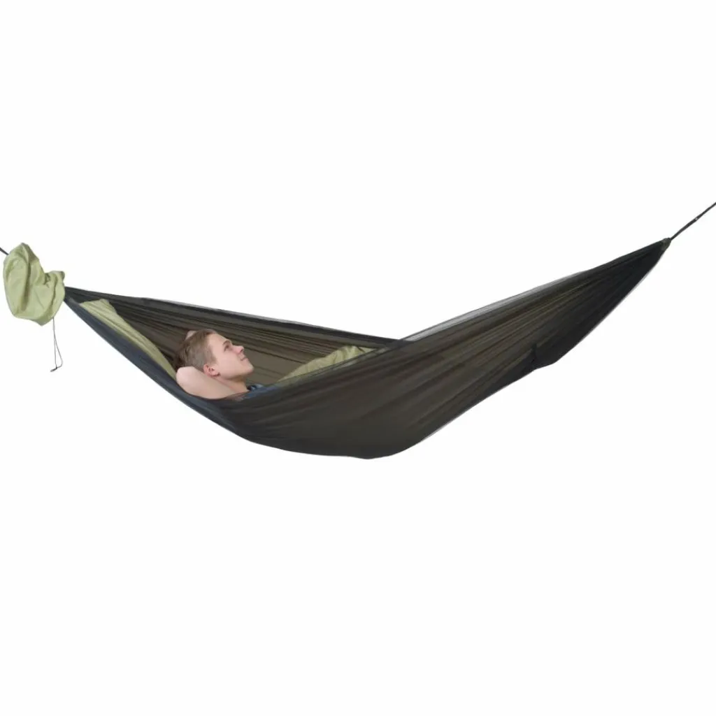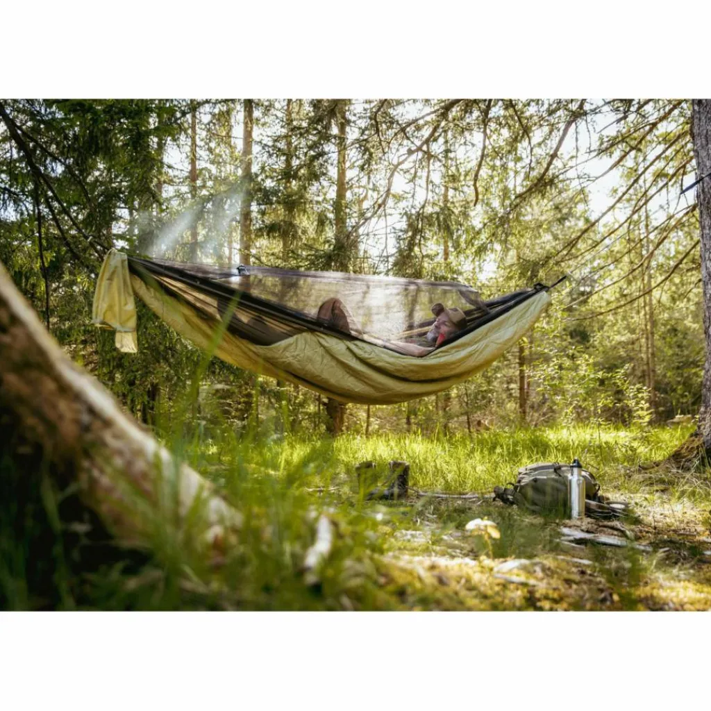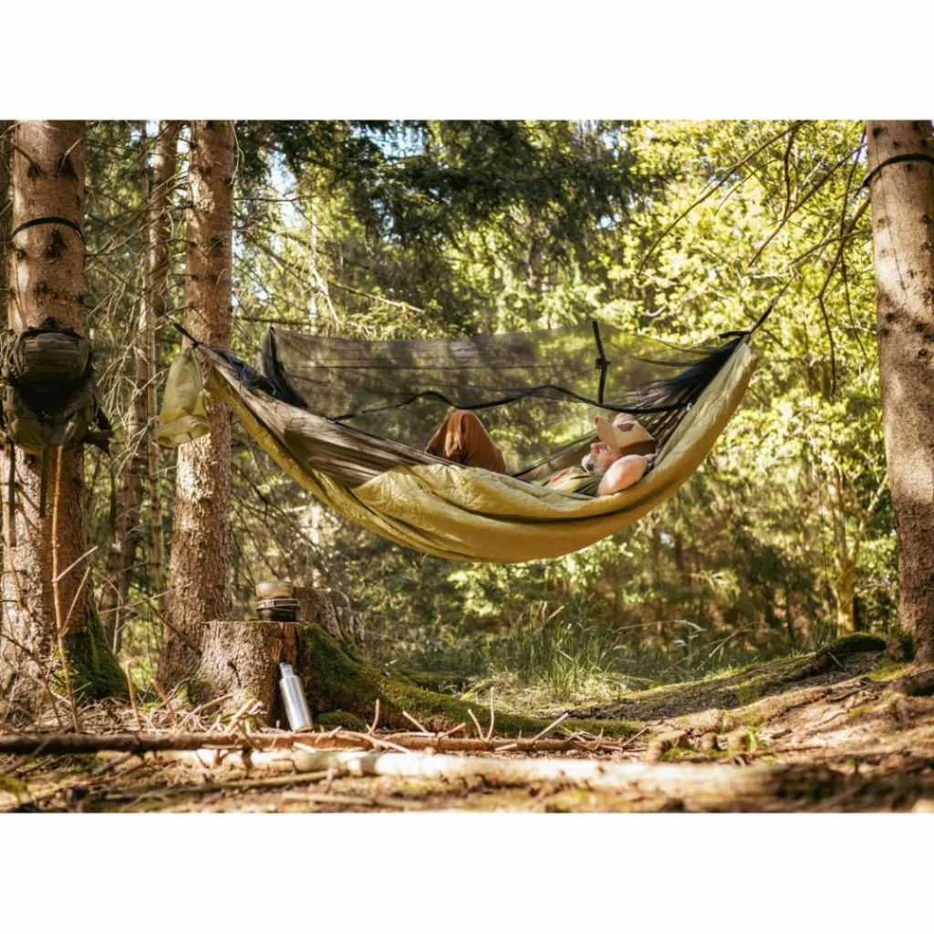 Außerdem ist ein wärmender Underquilt fest mit der Hängematte verbunden, der dir in der Nacht die nötige Wärme spendet. Den Quilt rollst du beim Aufbau gleich mit aus. Er ist so konstruiert, dass auch die rückenschonende diagonale Liegeweise möglich ist („brasilianische“ Liegeposition).