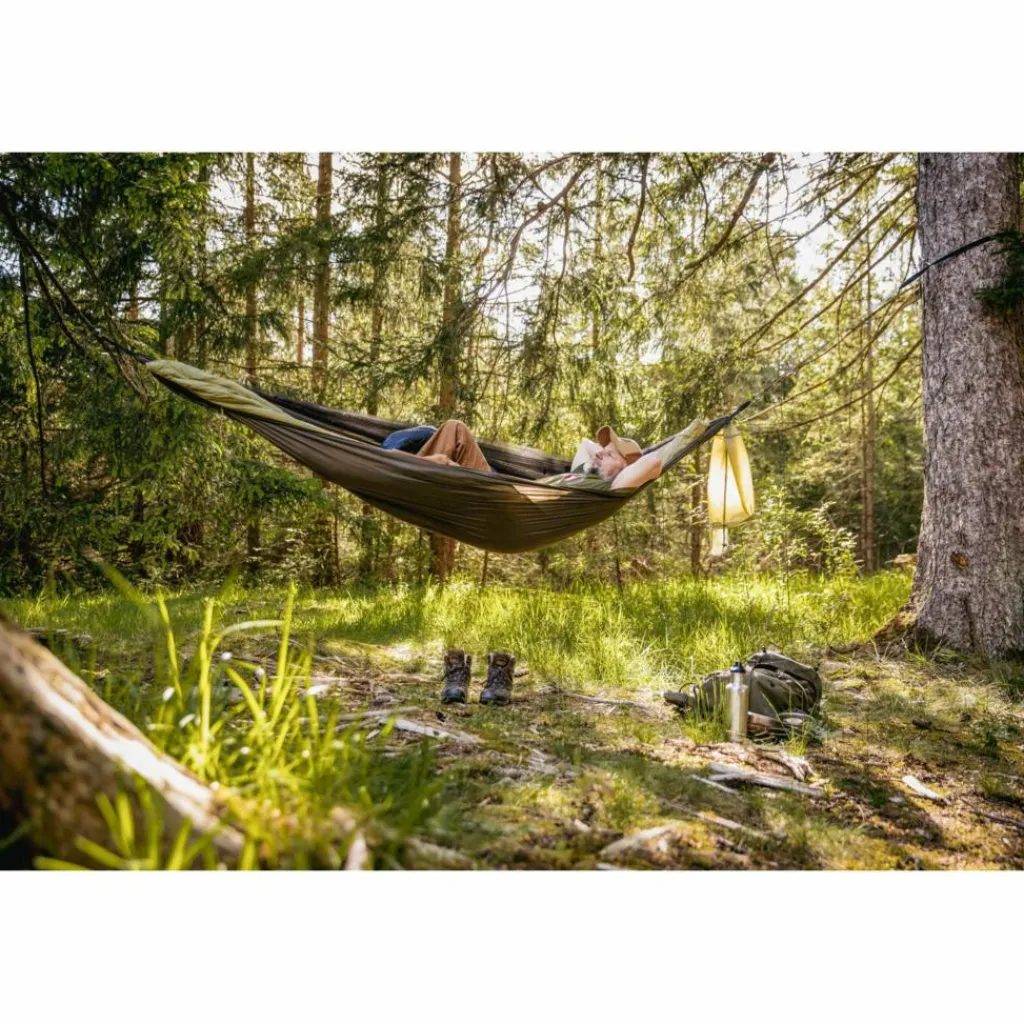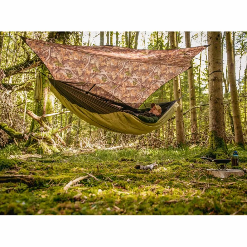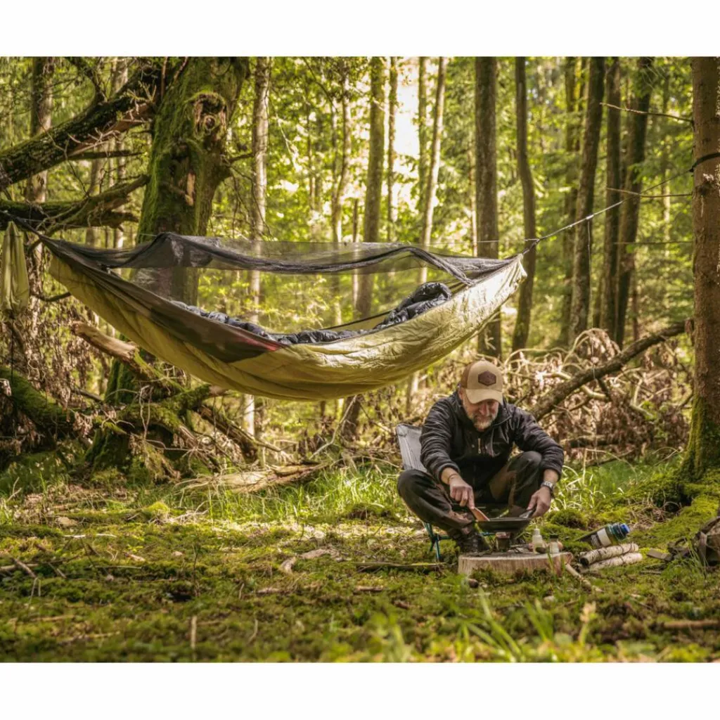 Außerdem ist ein wärmender Underquilt fest mit der Hängematte verbunden, der dir in der Nacht die nötige Wärme spendet. Den Quilt rollst du beim Aufbau gleich mit aus. Er ist so konstruiert, dass auch die rückenschonende diagonale Liegeweise möglich ist („brasilianische“ Liegeposition).