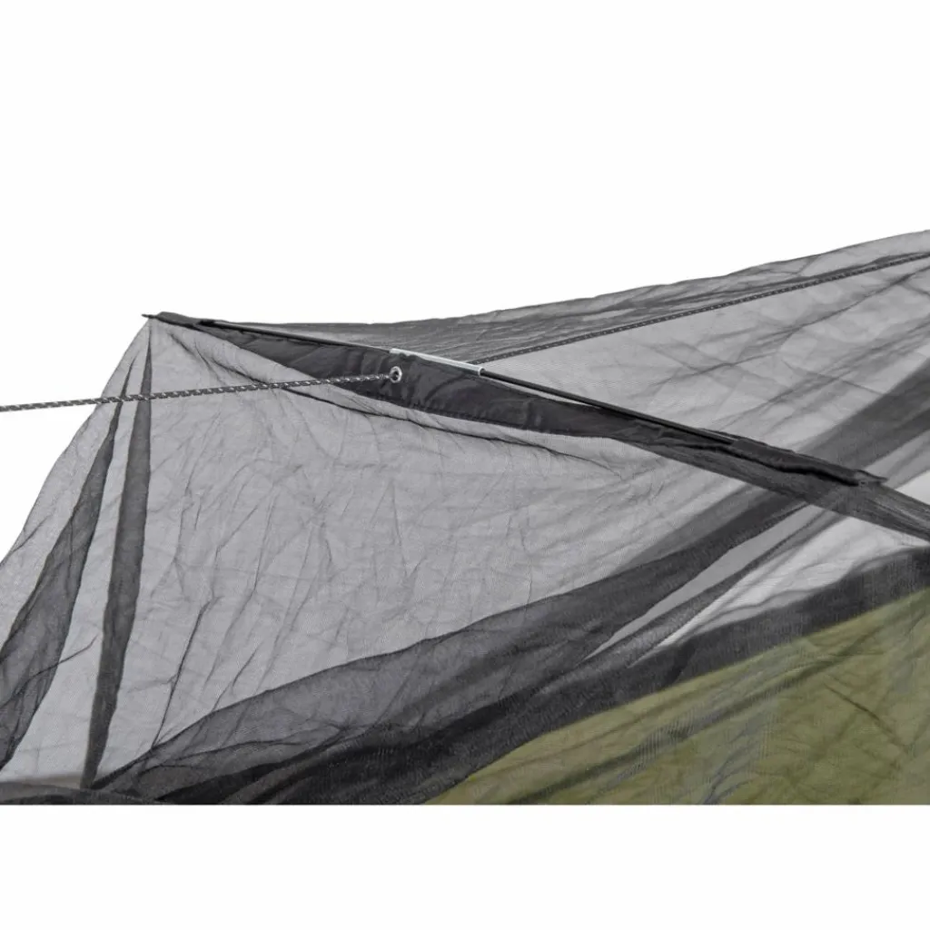 Eine Besonderheit stellt sich hier auch bei der Maschenweite ein. Da das Moskitonetz bei der Benutzung der Hängematte einer Dehnung unterworfen ist, kommt es zwangsläufig zu einer Änderung der Maschenweite. Ungedehnt bringt es das Netz auf sehr dichte 1500 Maschen pro square inch (Mesh/sqi). Wird das Gewebe extrem gedehnt, sind es immer noch beachtliche 1000 Maschen.
