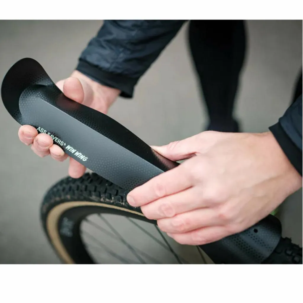 Der Win Wing 2 deckt dabei genau den Reifen-Bereich ab, der es schleudertechnisch auf dich abgesehen hat: Dreck, Schlamm und Wasser, die hier den Reifen verlassen, nehmen den kürzesten Weg hin zu deinem Gesäß und deinem Rücken. (Achtung, Physik: Schussrichtung ist immer im 90-Grad-Winkel zum Radius des Kreises, also deines Reifens.)
