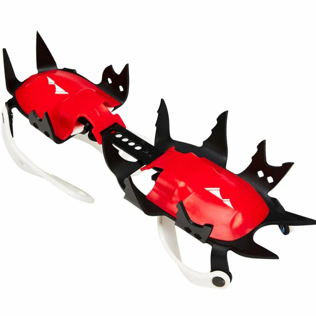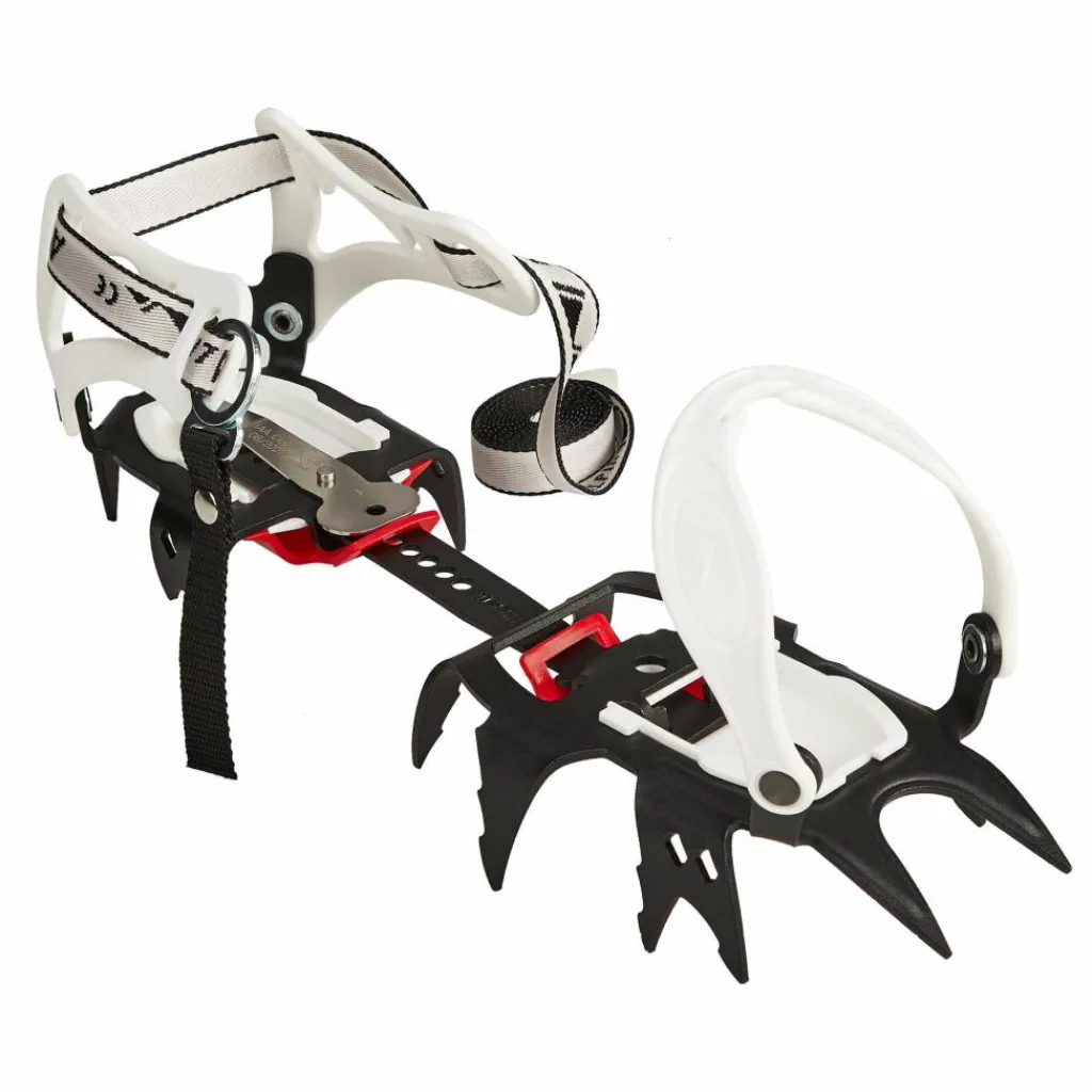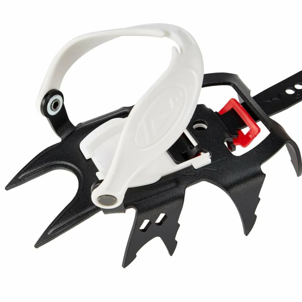 Das Skyclimb ist mit 12 hochfesten Zacken aus pulverbeschichtetem Stahl ausgerüstet. Am seitlichen Vorderfuß sind zwei Zacken nach unten hin aufgespalten (so könnte man es fast schon als 14-Zacker bezeichnen), auf alle Fälle beißen sie sich dadurch mit noch mehr Stabilität in festes Eis.