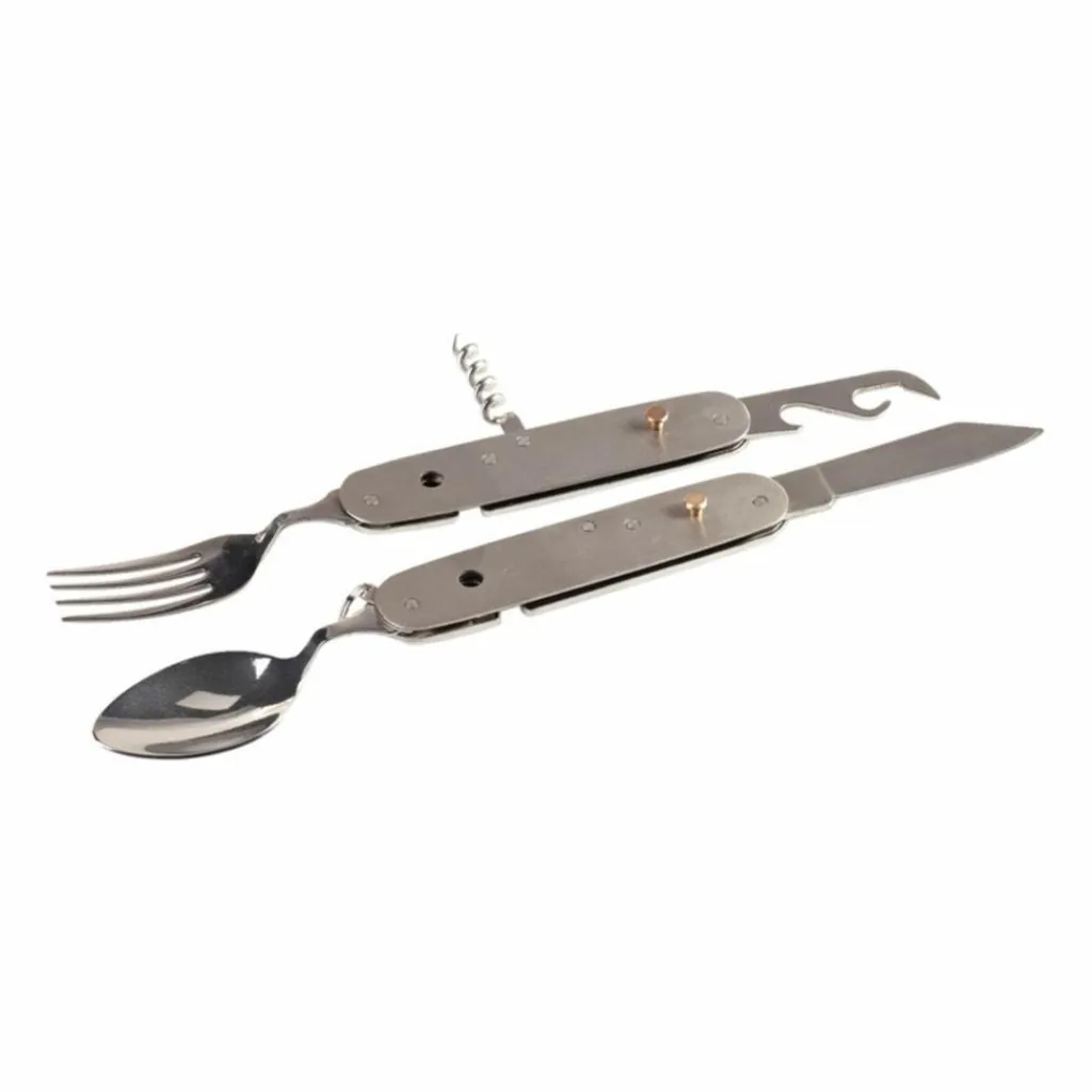 Set aus Messer, Löffel, Gabel, Dosenöffner, Korkenzieher und Ahle. Die beiden Schalen lassen sich entriegeln und so in Messer, Löffel und Ahle auf der einen, den Rest auf der anderen Seite teilen.