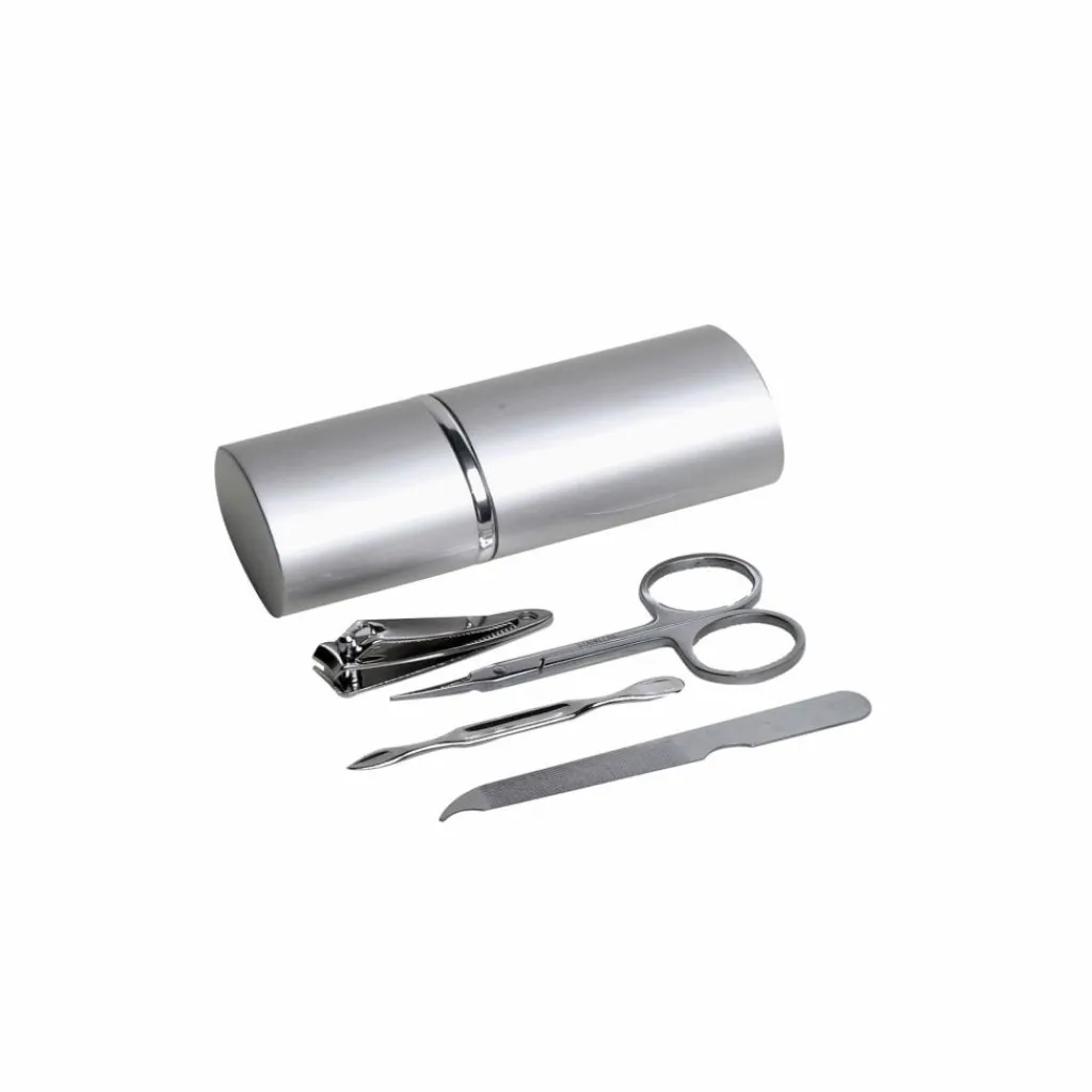 Reise-Maniküre-Set für unterwegs mit Nagelreiniger, Nagelfeile, Nagelklipper und Schere aus Edelstahl. Das Set wird in einer Aluminium-Dose geliefert.