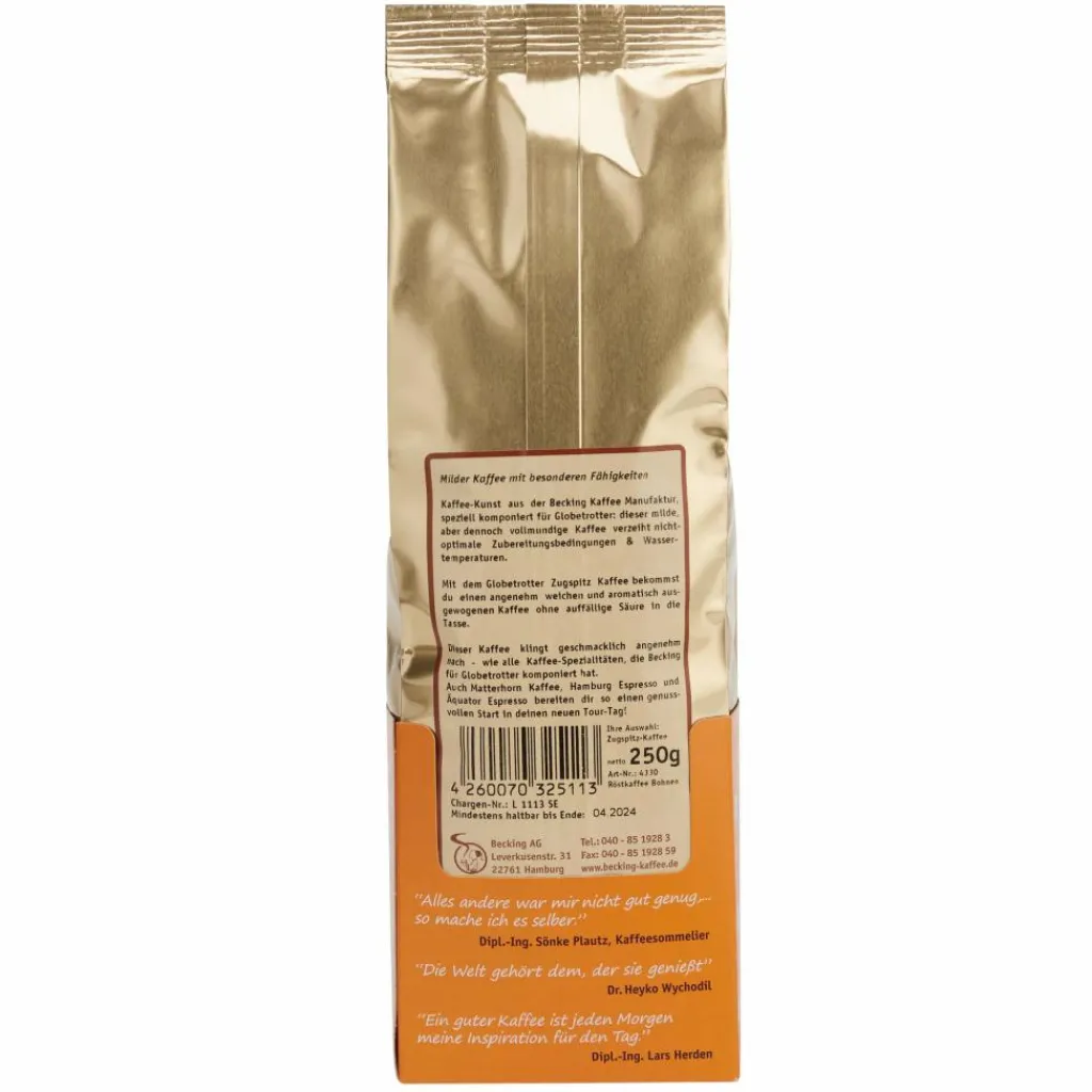 Mit dem Globetrotter Zugspitz Kaffee bekommst du einen angenehm weichen und aromatisch ausgewogenen Kaffee ohne auffällige Säure in die Tasse. Dieser Kaffee klingt geschmacklich angenehm nach – wie alle Kaffee-Spezialitäten, die Becking für Globetrotter komponiert hat. Auch Matterhorn Kaffee, Hamburg Espresso und Äquator Espresso bereiten dir so einen genussvollen Start in deinen neuen Tour-Tag!