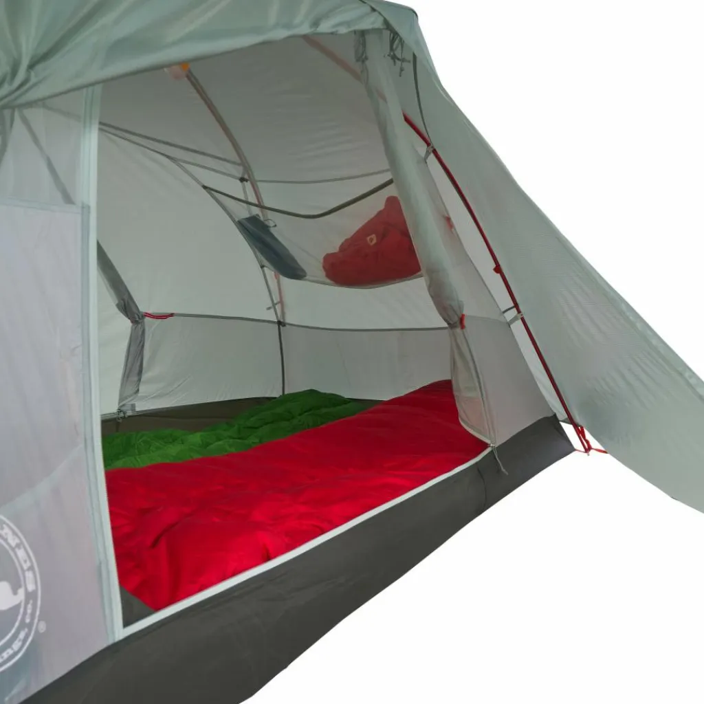 Im Fußbereich steht dir eine große 3D-Tasche zur Verfügung. Dort lässt sich voluminöse Bekleidung verstauen, sodass sie nicht neben die Isomatten gequetscht werden muss. In der flach anliegenden Deckentasche im Kopfbereich kannst du Bücher, Karten oder das Smartphone unterbringen. Zudem stehen dir zwei Seitentaschen zur Verfügung, in denen du eine Stirnlampe oder deine Brille jederzeit griffbereit verstauen kannst.
